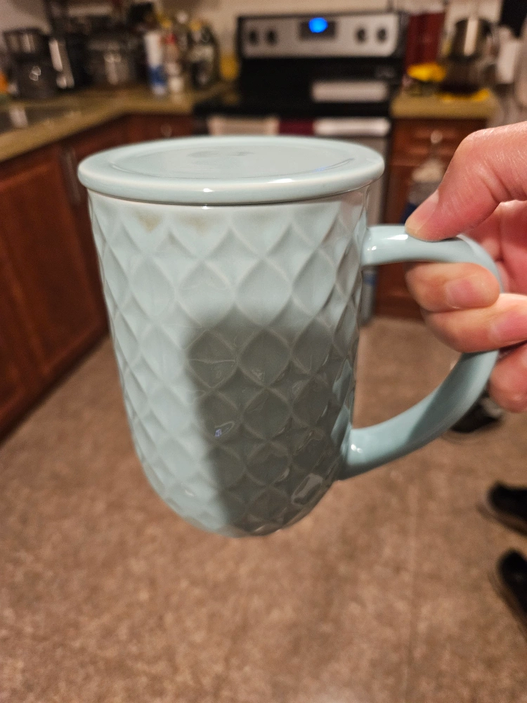 Gfitong ceramic mug that comes with a lid. It has a unique textured design. There are some signs of use, as pictured, but overall it's in good condition. Perfect for enjoying your favourite hot beverage!