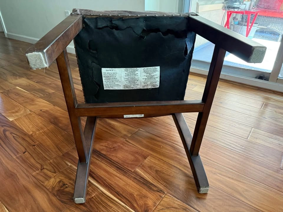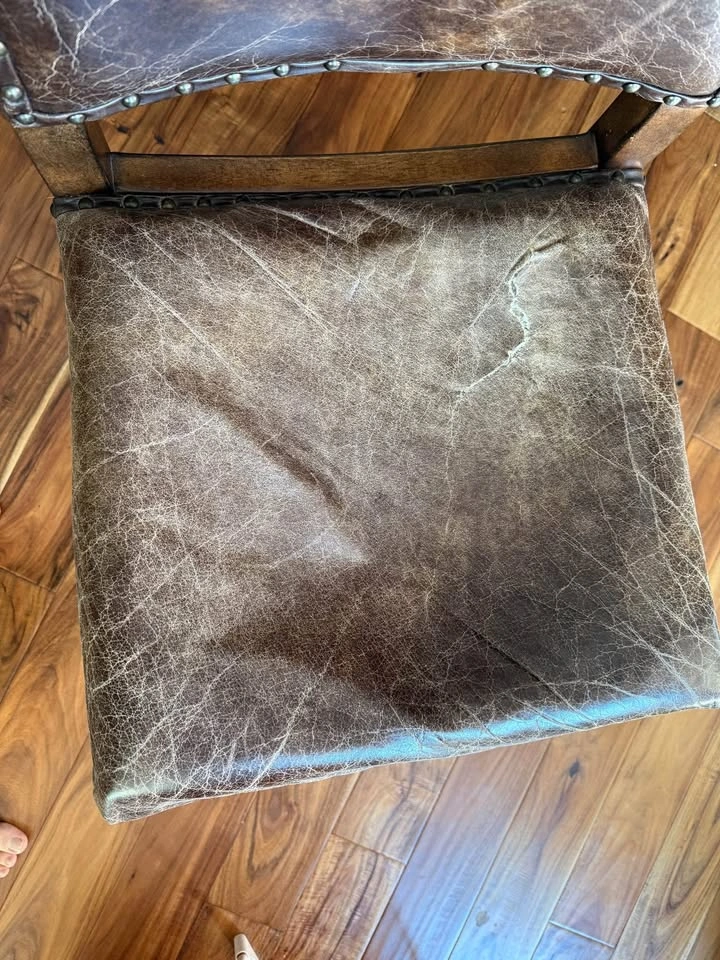 Solid, sturdy, great quality dining chair from Pottery Barn. Has been well used over the years, the seat has lost some firmness, leather on the seat has a tear. Ideally needs reupholstering. Underside has some tears. 1 of a set of 4 Approx dimensions: Height 36.5 inches Width 18.5 inches Depth 21.5 inches Seat height 20 inches Seat depth 17 inches