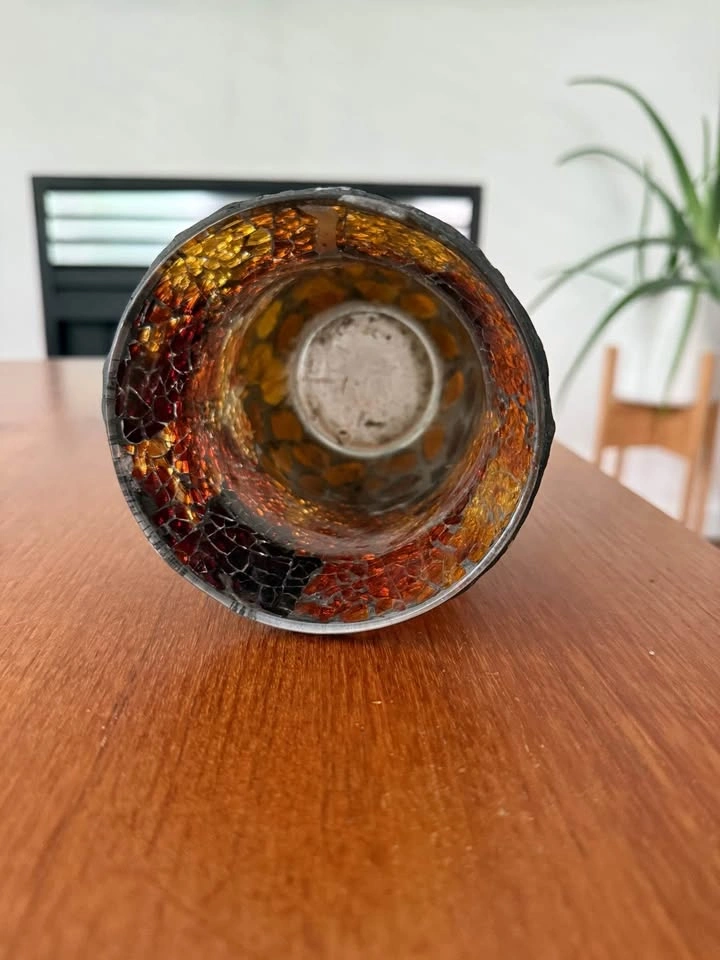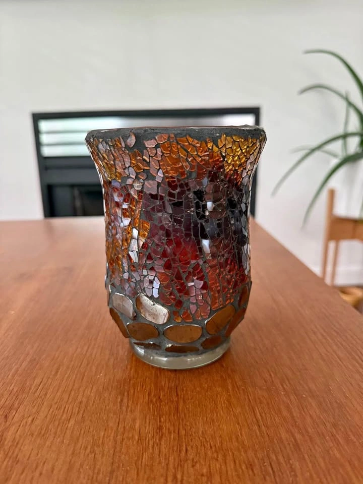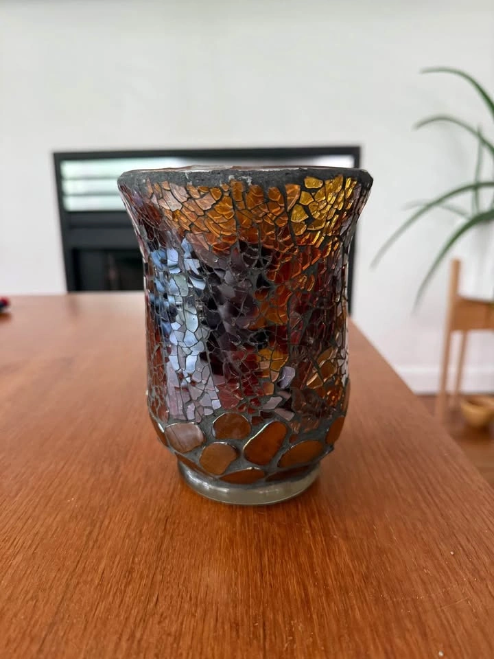 Decorative mosaic glass vase with a flared rim, featuring warm amber, rich brown, and black tones. Has been used to hold candles so has traces of melted wax inside. Approx dimensions: Width 11.5cm Height 15cm