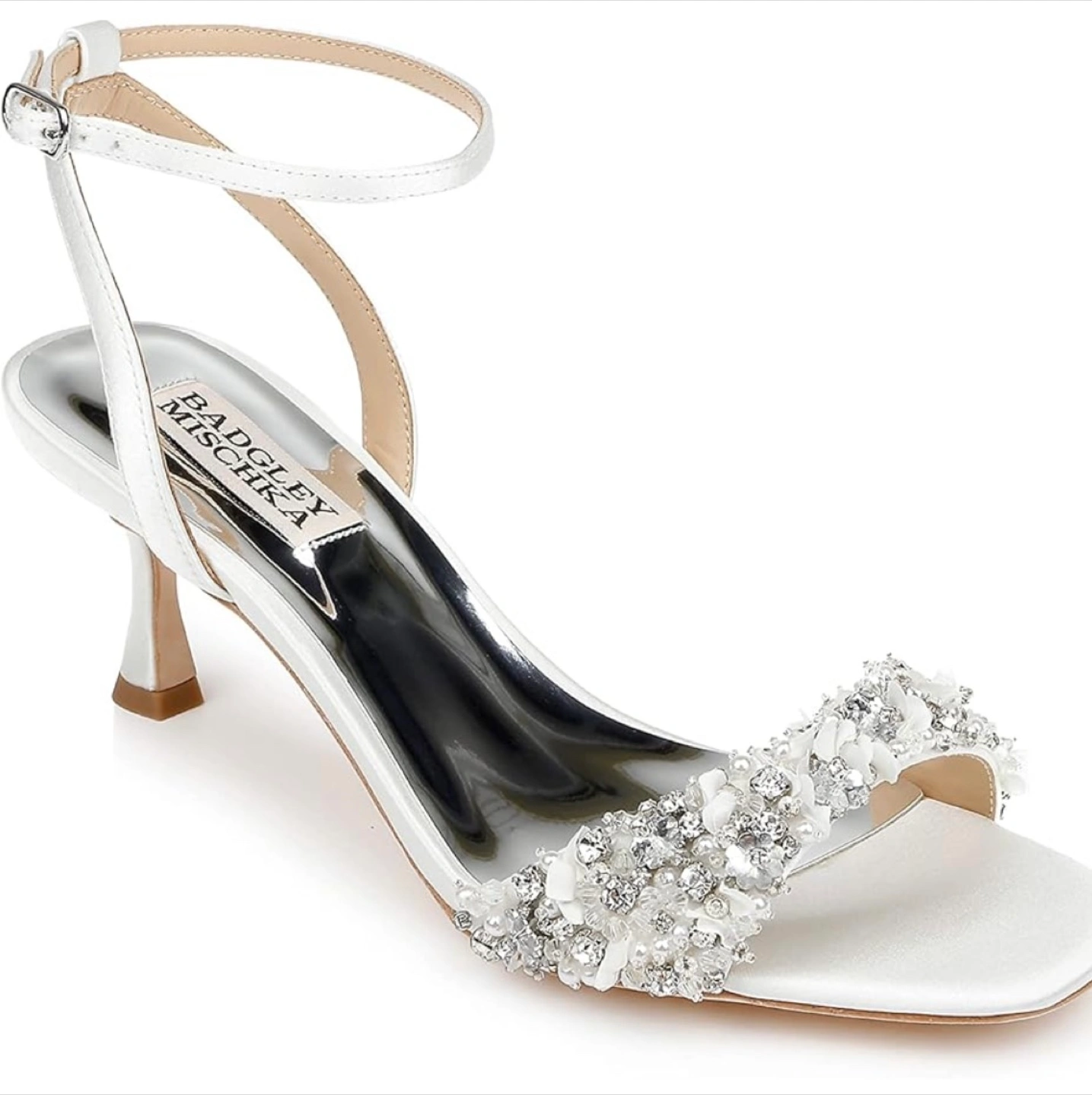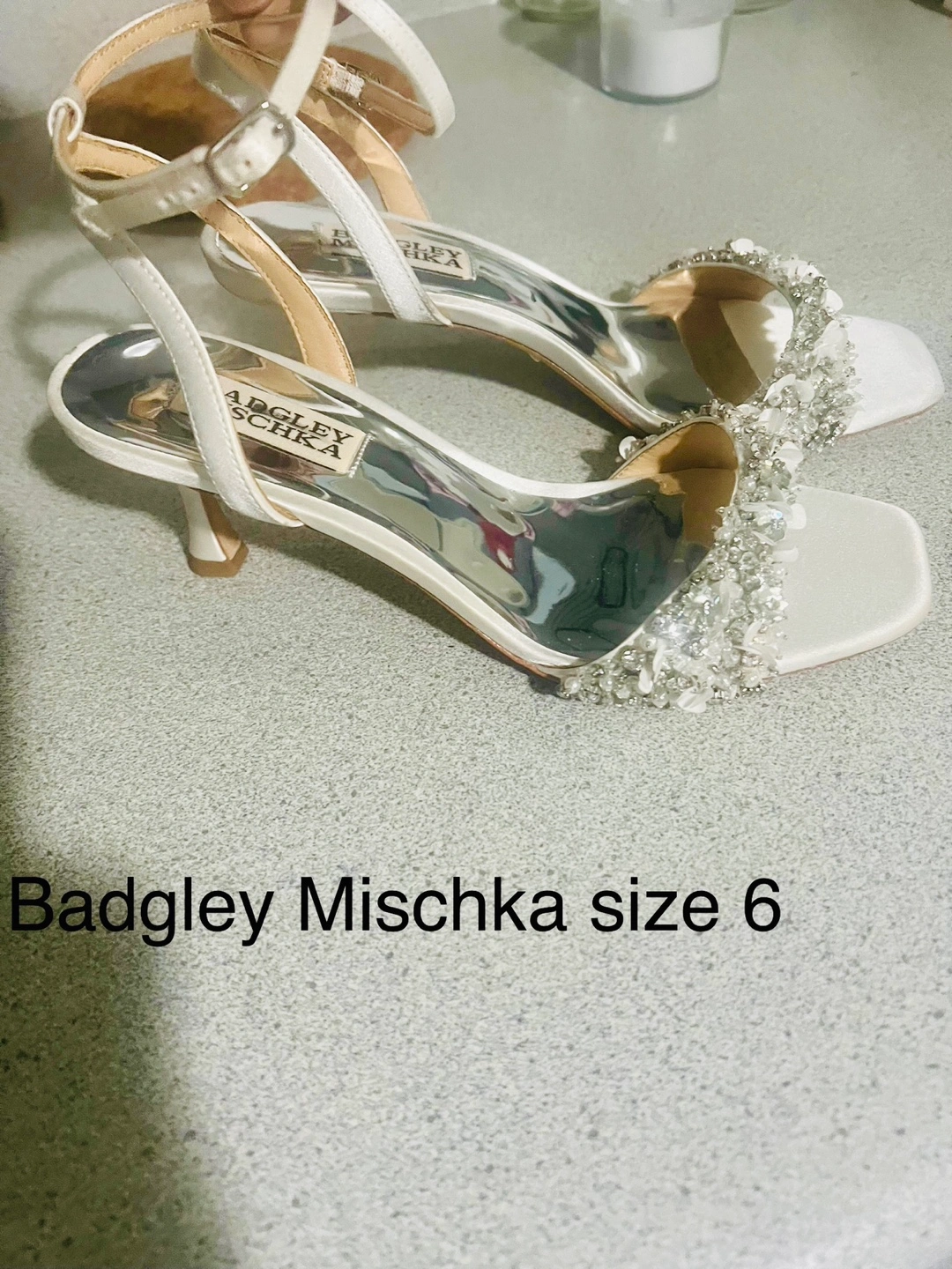 These are a beautiful pair of Badgley Mischka heels in a size 6. They feature delicate embellishments and a stylish design, perfect for a special occasion or to add a touch of elegance to any outfit. They're in great condition and ready for a new home!