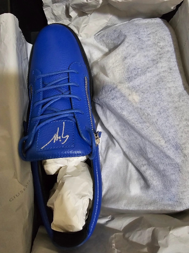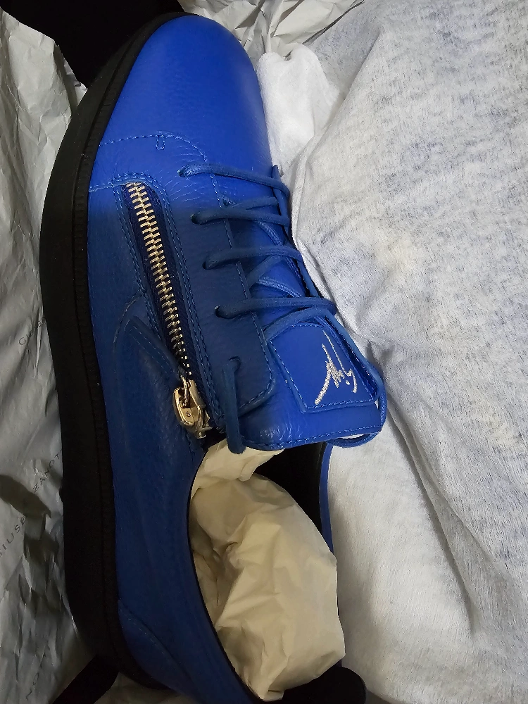 Selling this authentic pair of Giuseppe Zanotti sneakers in a vibrant blue leather! They come with the original box and dust bag. These shoes feature a stylish zipper detail and are brand new - never worn.