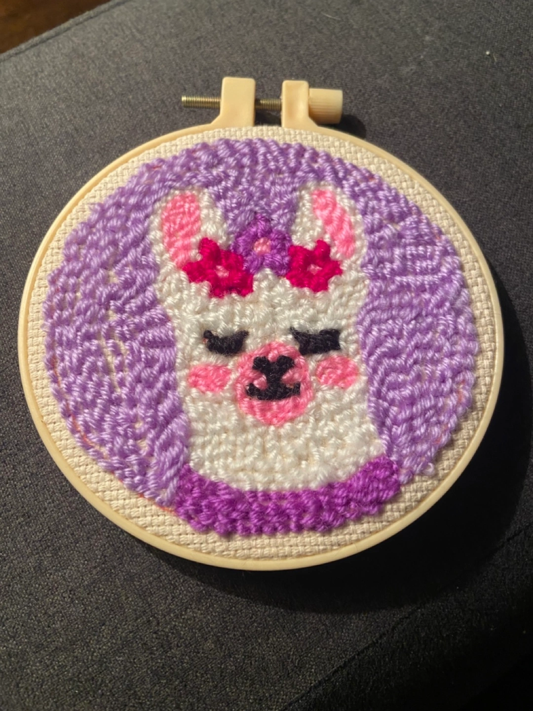 This charming, handmade punch needle artwork features an adorable llama with a floral crown, all framed in a small, round embroidery hoop. The piece is crafted with purple, pink, and white yarn, making it a delightful addition to any room.