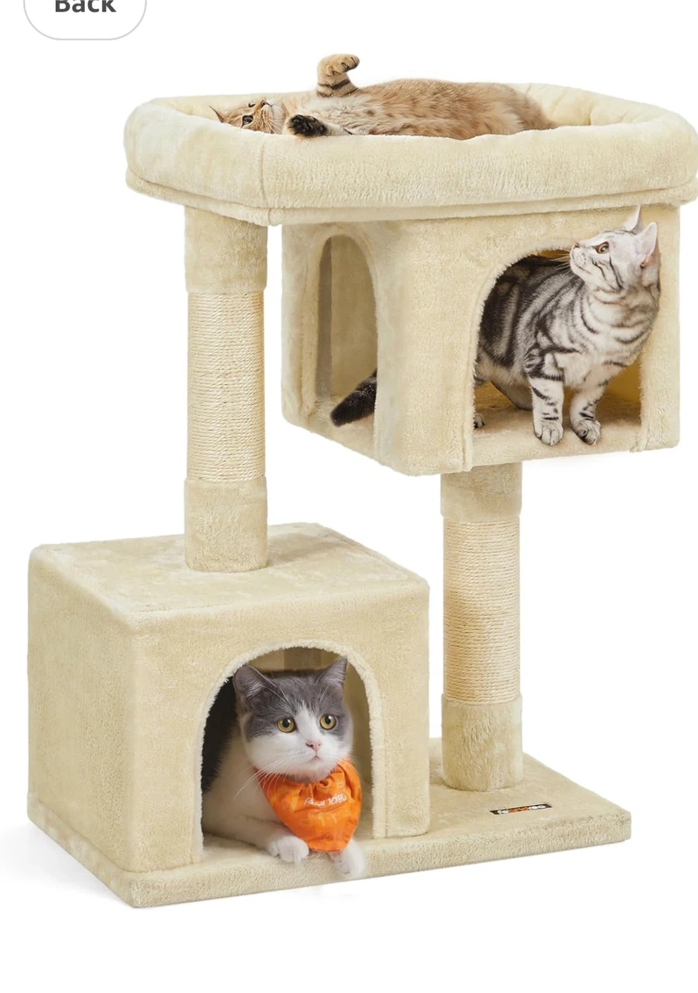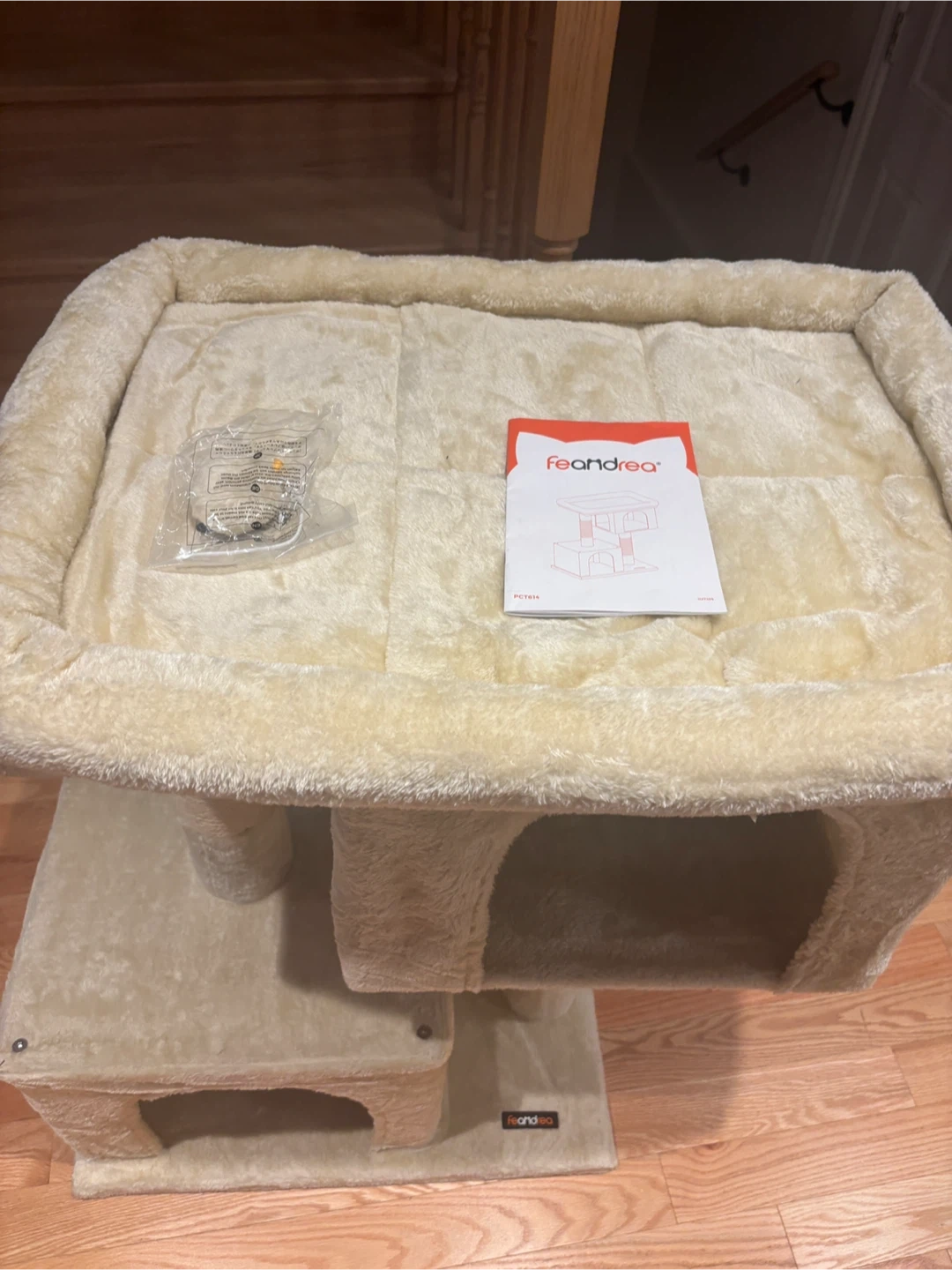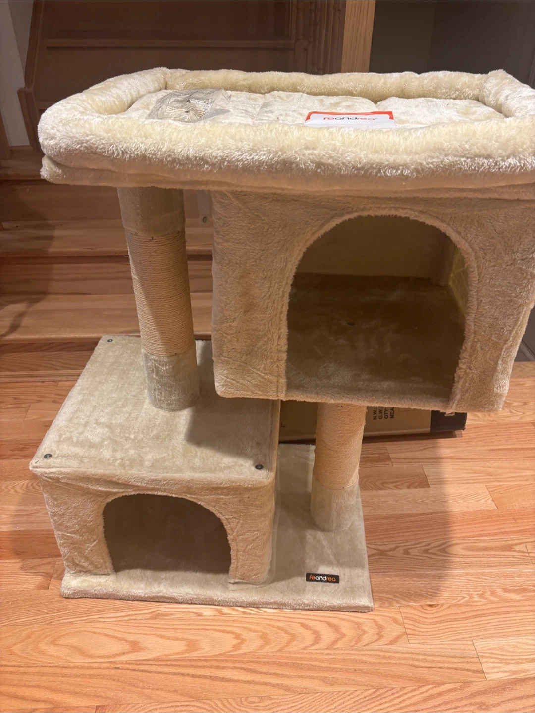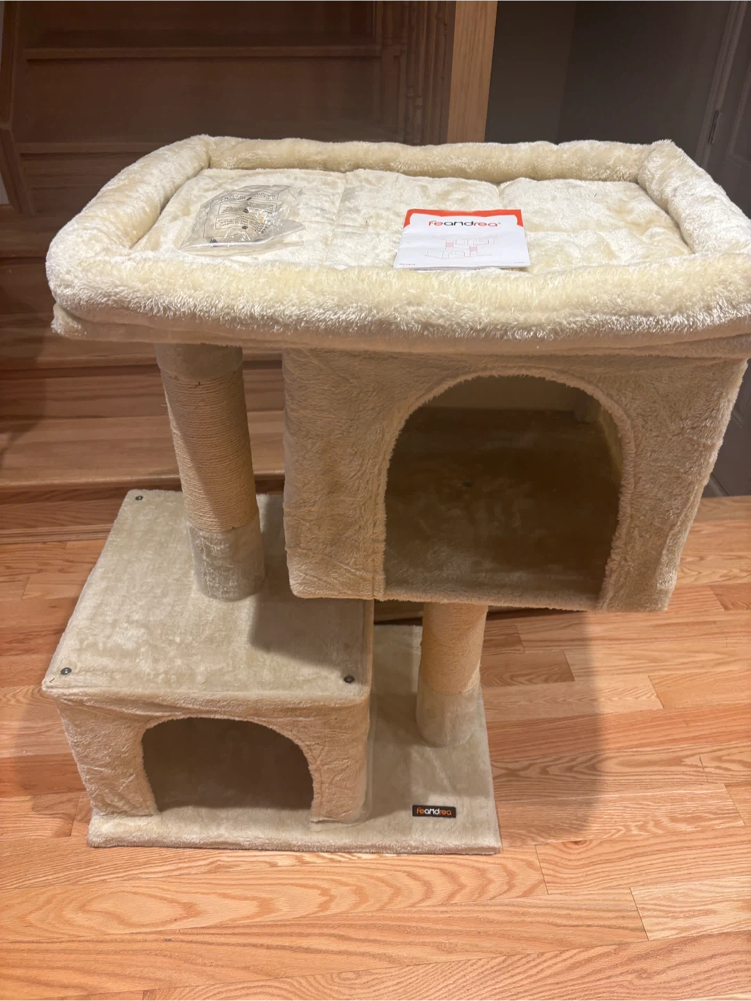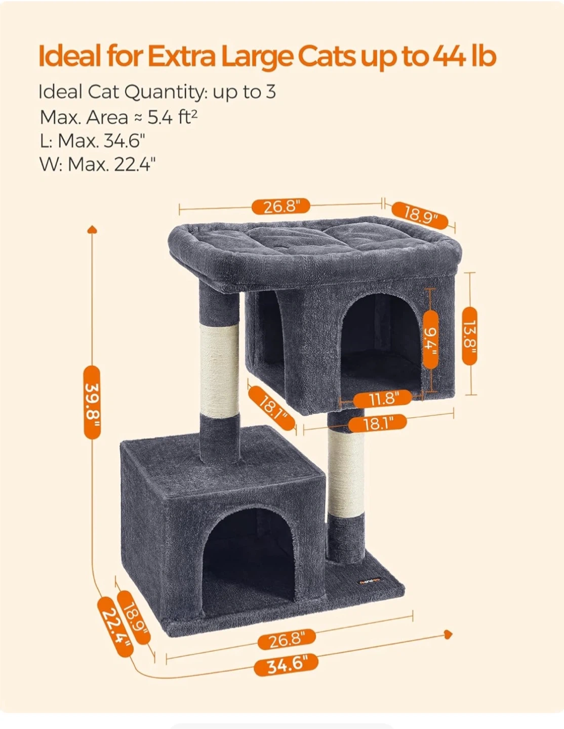 Selling a Feandrea cat tree, perfect for your feline friends! It's designed for extra-large cats, supporting up to 44 lbs. The cat tree has a maximum area of 5.4 ft². Dimensions are: Length: 34.6", Width: 22.4", Height: 39.8". It can accommodate up to 3 cats, providing plenty of space for them to play and relax