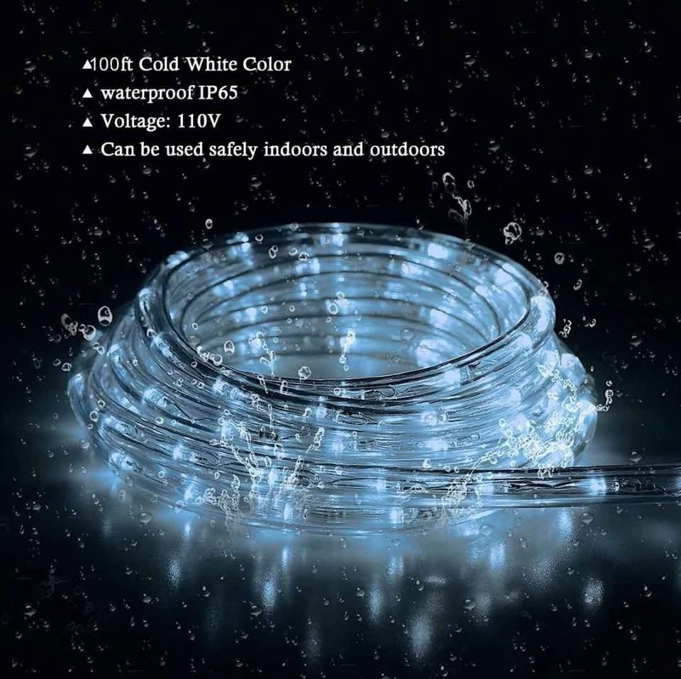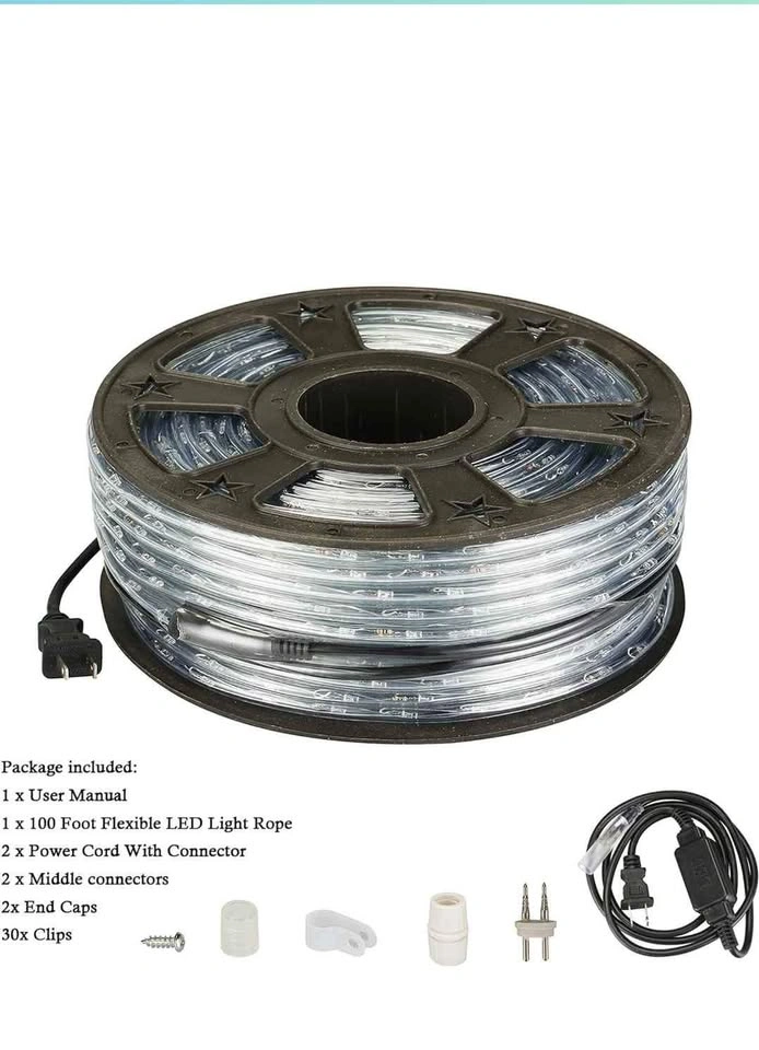 Brighten your indoor and outdoor areas with this 100ft waterproof LED strip light kit in cool white. Ideal for patios, eaves, gardens, and more, these durable 110V cold white string lights are easy to install and built to withstand all weather conditions. Pick up in Oakville.