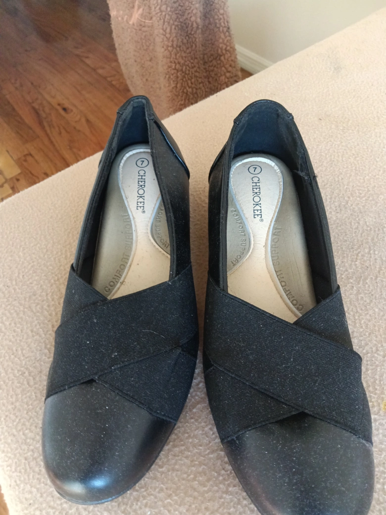 Selling a pair of Cherokee comfort support shoes in black. They are size 7 and feature a cross strap design. These shoes are perfect for everyday wear!