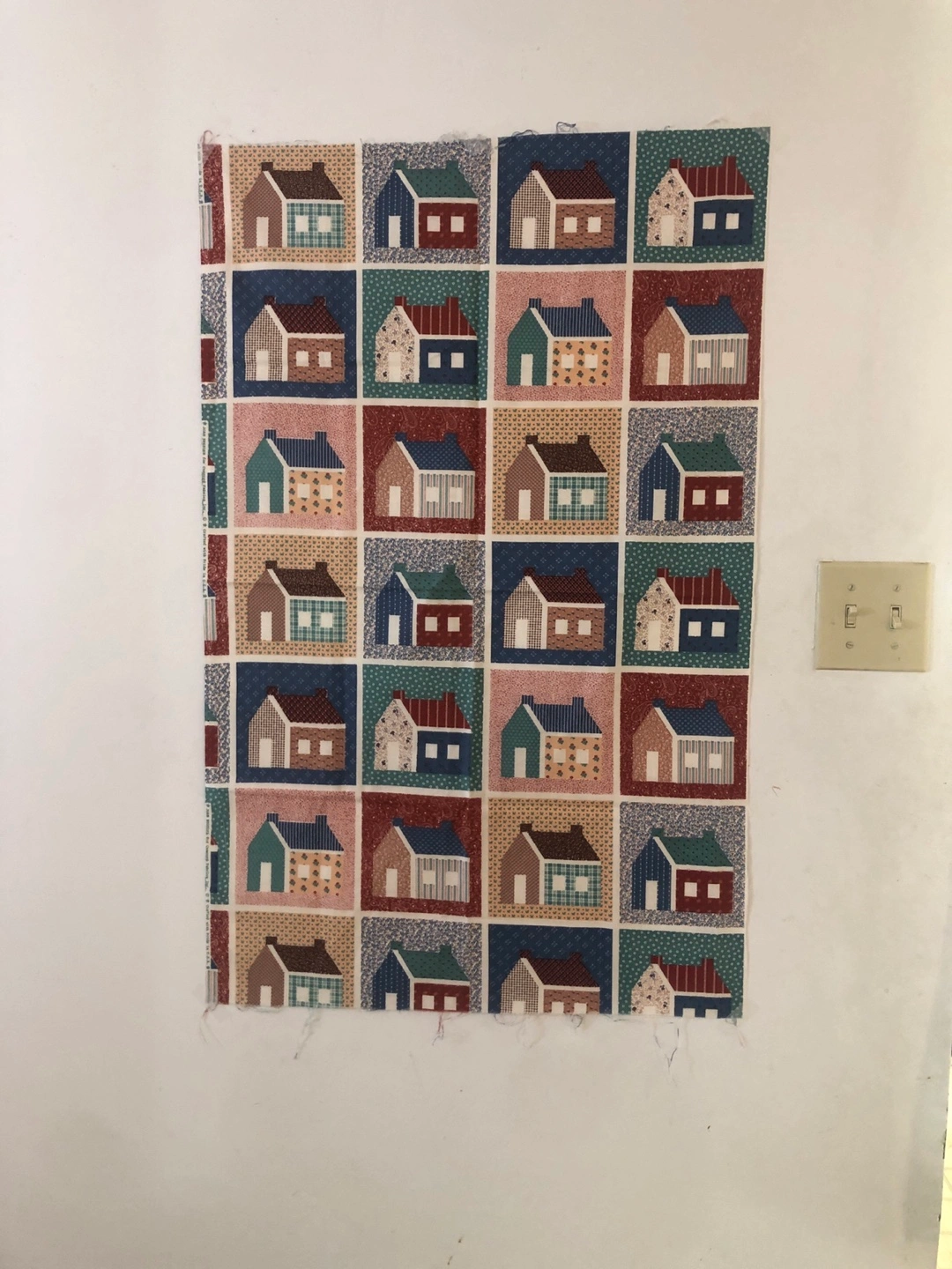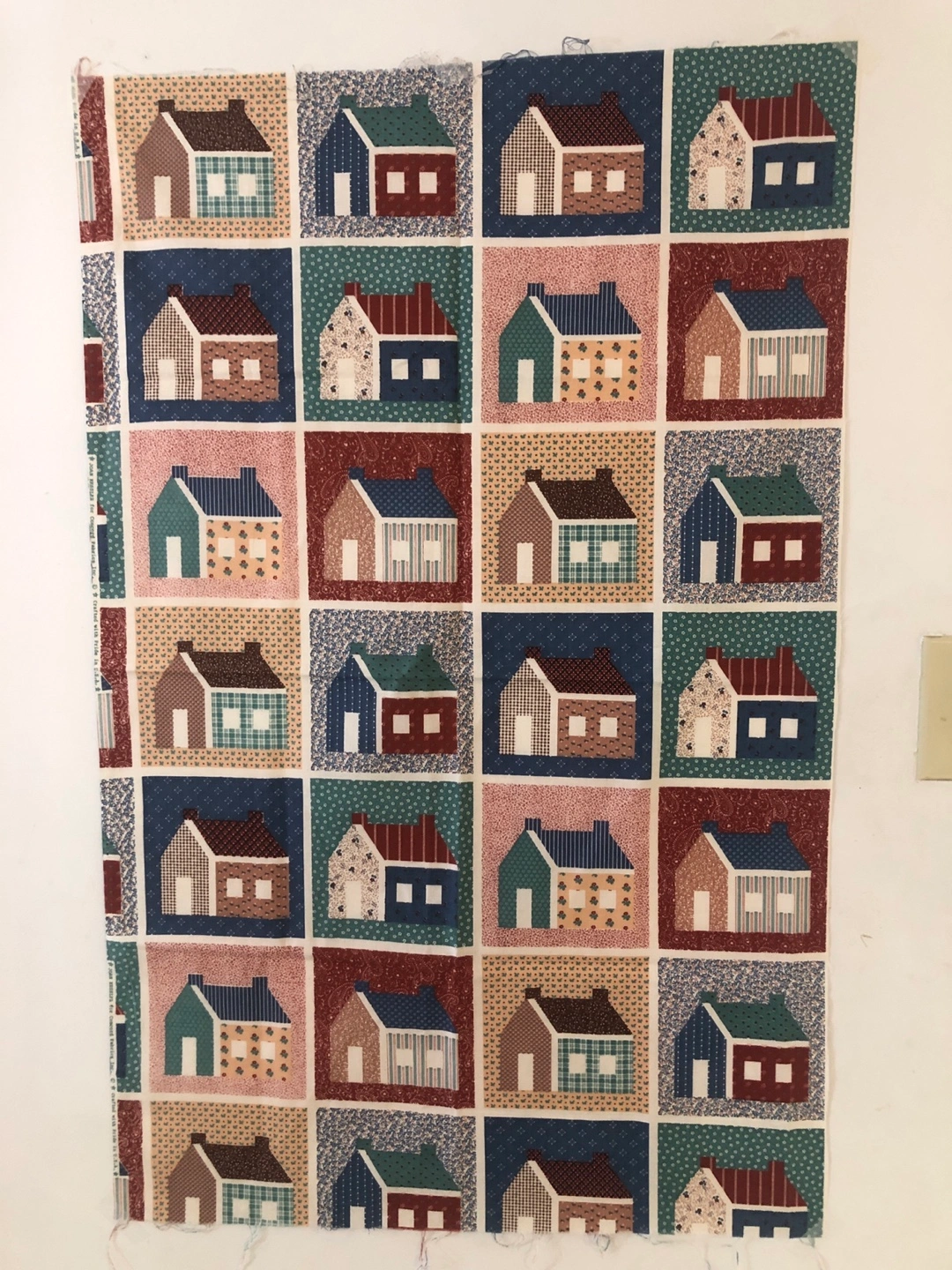 This is a piece of quilt fabric with a charming house pattern. It features various house designs in different colours and arrangements. Perfect for your next quilting project!