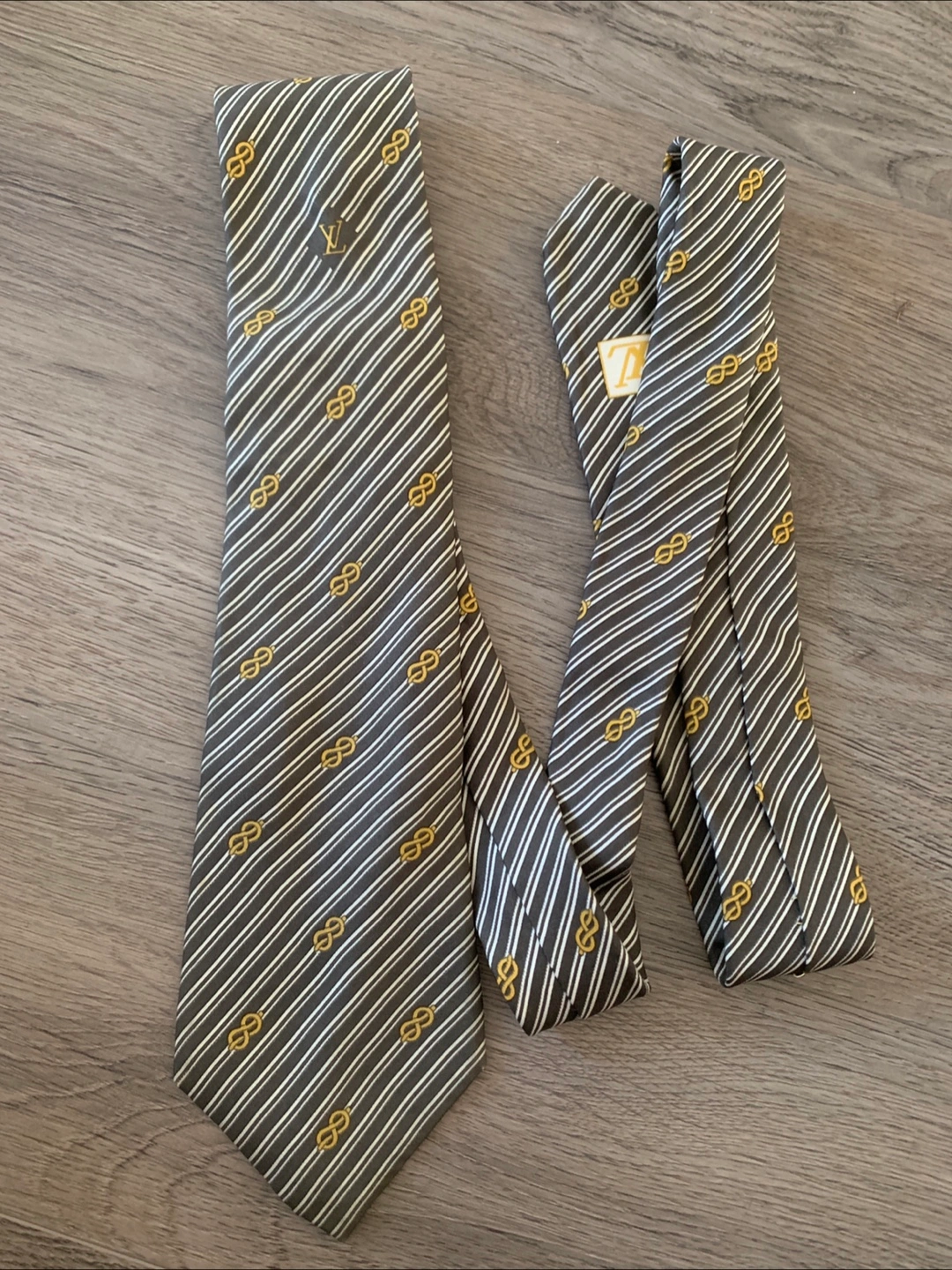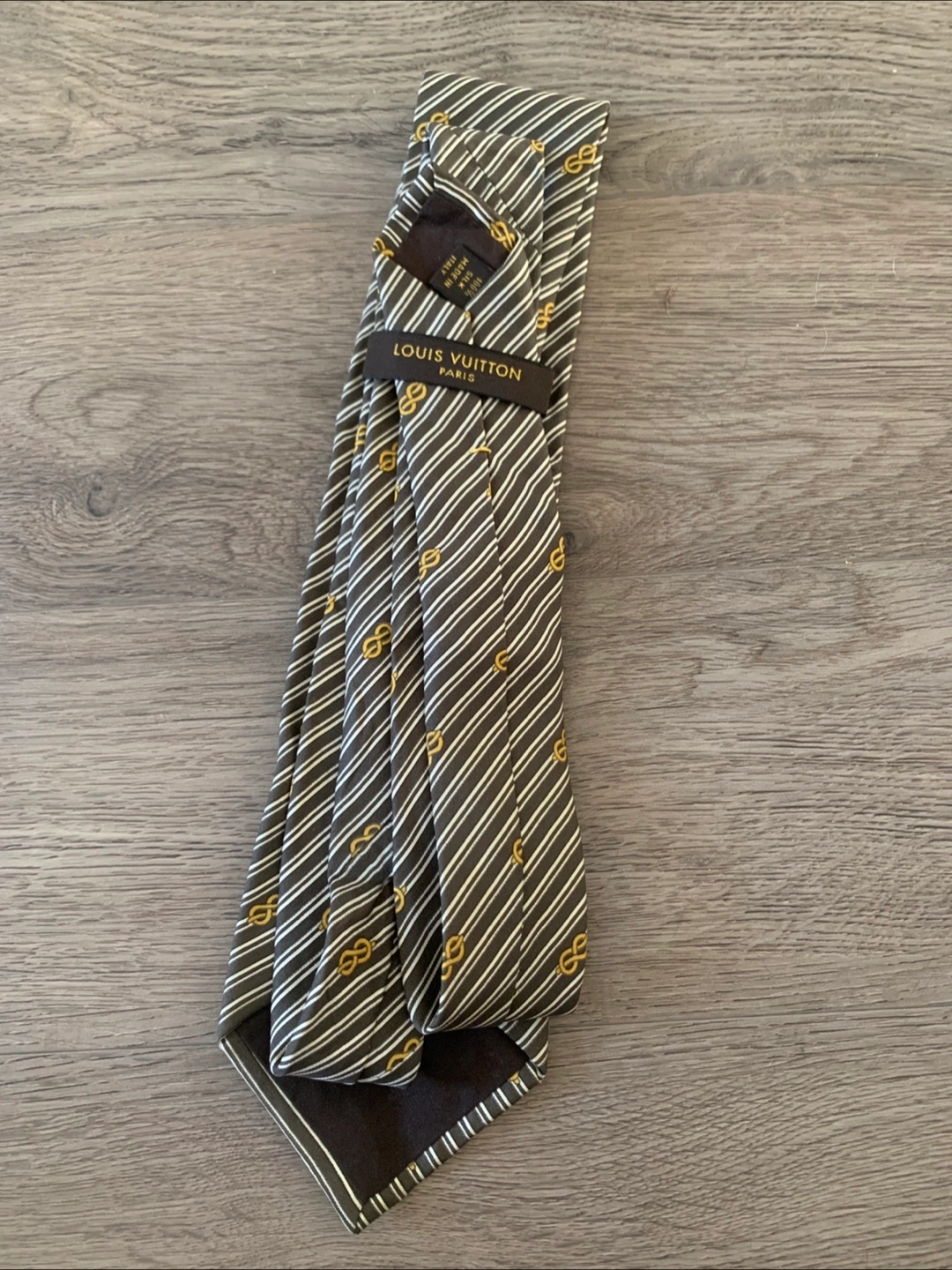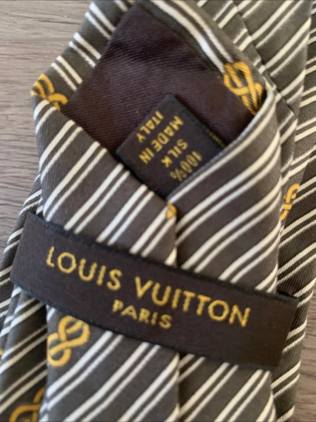 Selling a stylish Louis Vuitton tie made from 100% silk! It features a sleek grey colour with white stripes and a subtle LV pattern. A great addition to any wardrobe!