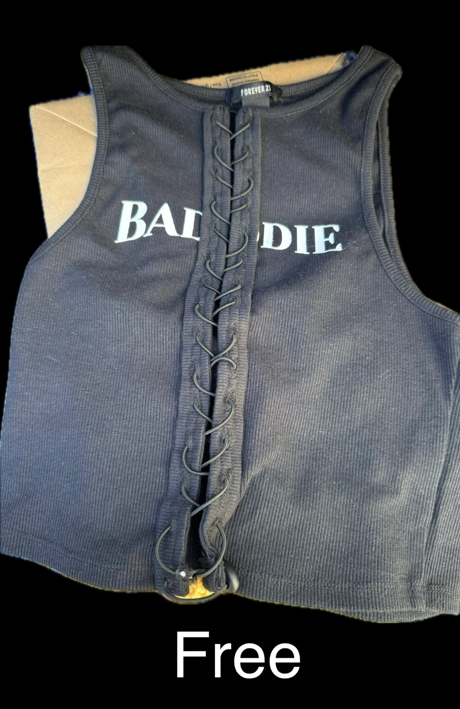 1000+This is a cute black ribbed tank top from Forever 21! It features a lace-up front detail and the words "BAD BADDIE" printed on the front. Perfect for a casual day out or a night with friends