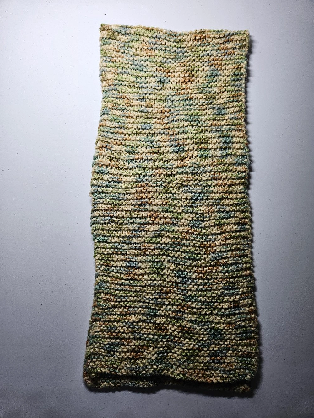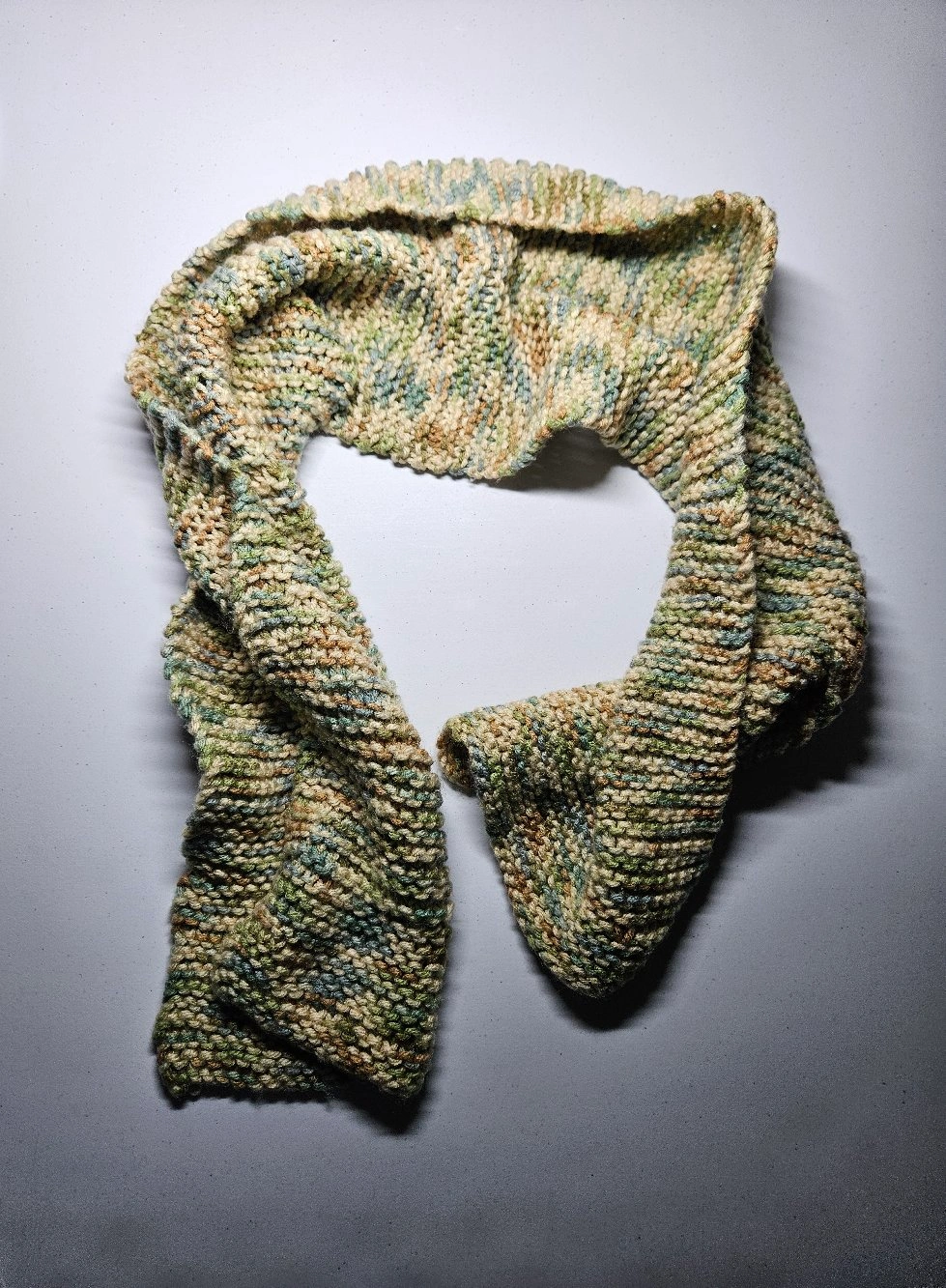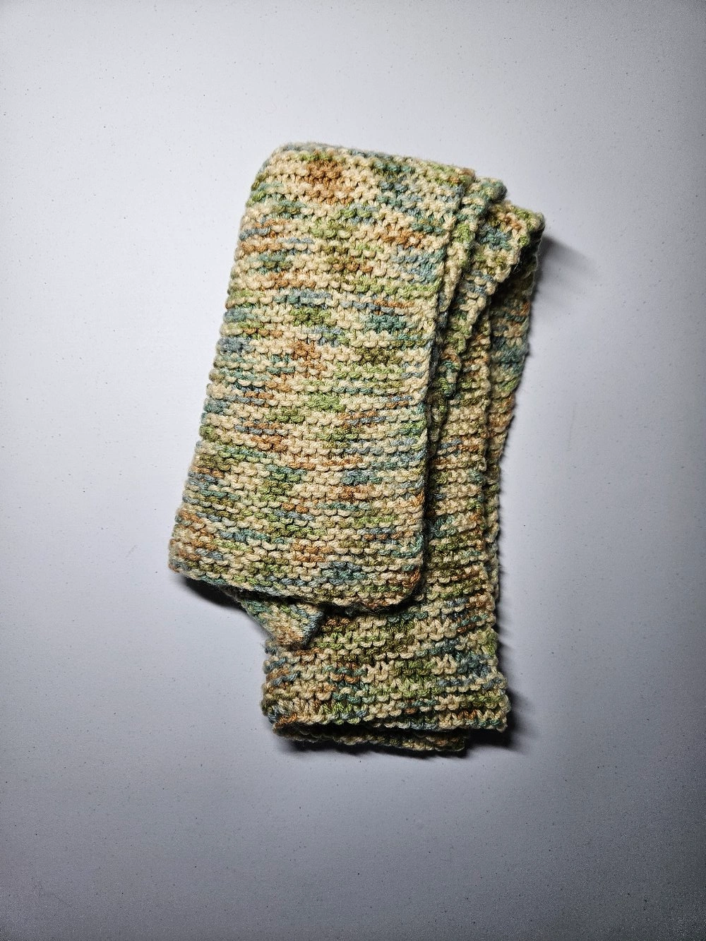 Selling a cozy (pre-owned), handmade knitted scarf. It has a nice, soft texture and features a blend of colours including beige, green, and blue. Good for staying warm on chilly days!