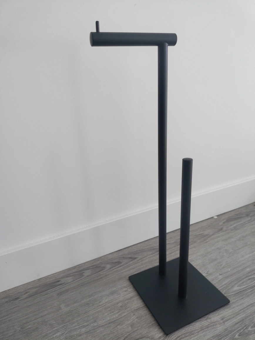 Here's a sleek black metal toilet paper holder stand. It's in great shape and ready to add a touch of modern style to your bathroom