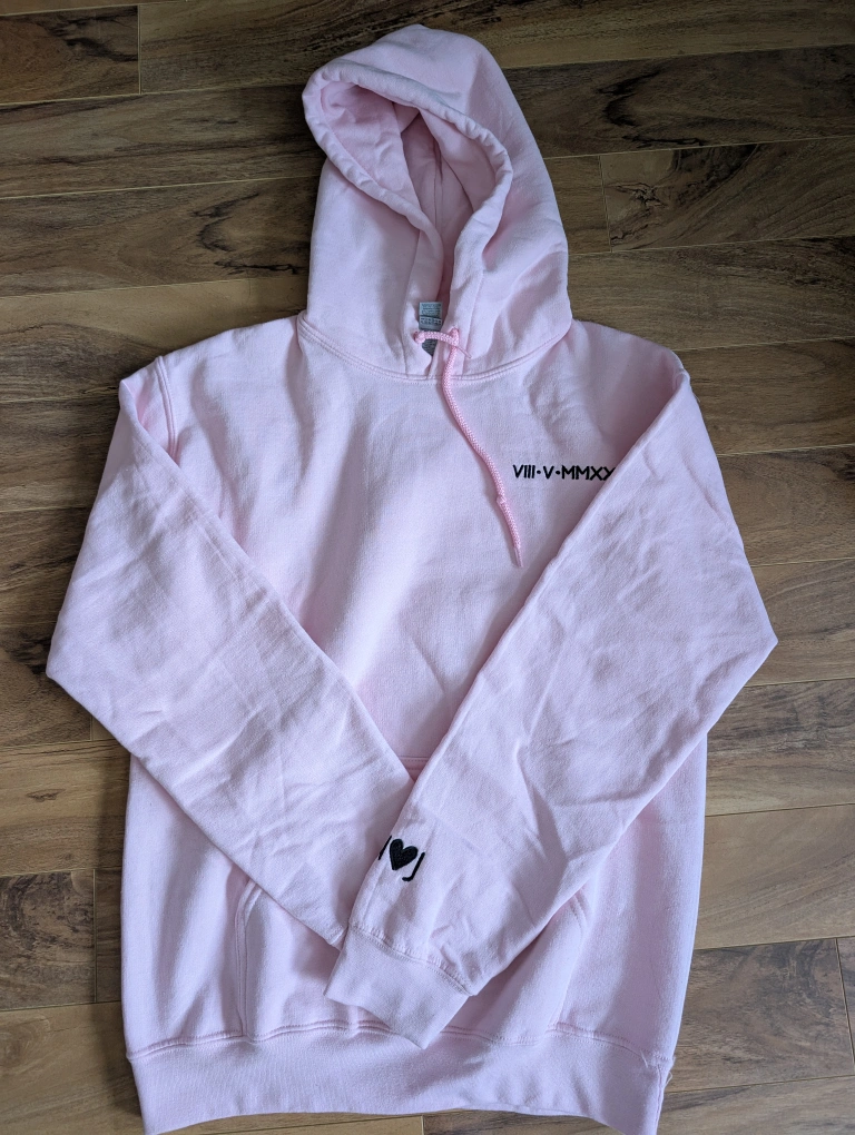 Here's a comfy pink Gildan hoodie! It features a design on the upper left chest and a cute heart detail on the sleeve. Perfect for cozy days or layering up.