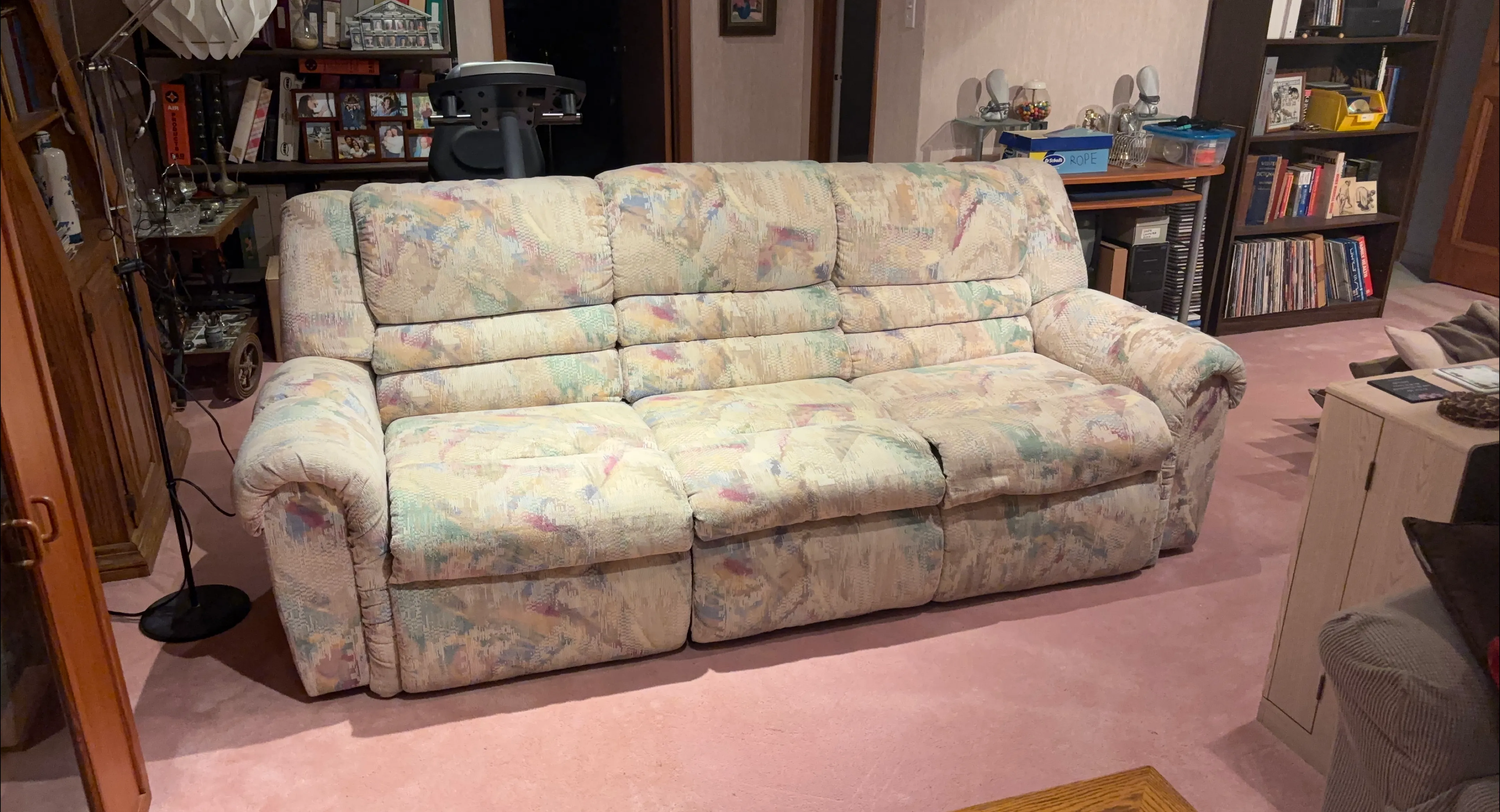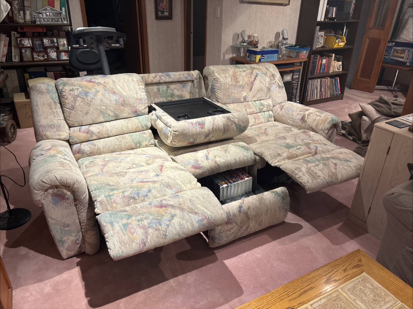 The sofa features reclining seats and a pull-down tray table and pull out drawer for added convenience. It's in good condition and ready for a new home!