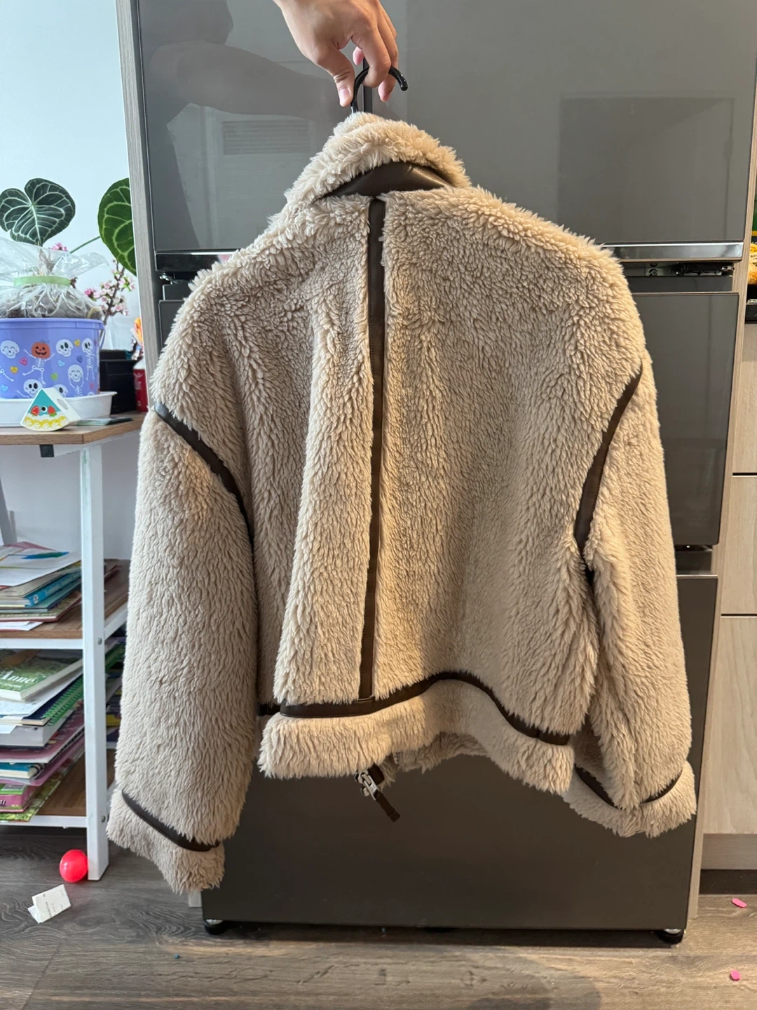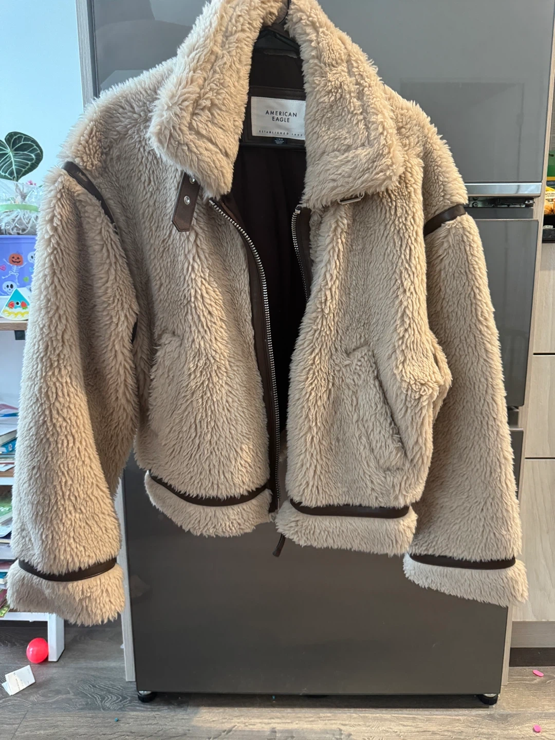 15Cozy up in this American Eagle sherpa jacket! It's a stylish and warm layer for those chilly days. The jacket features a soft sherpa material with brown trim detailing. Perfect for adding a touch of texture to your outfit!