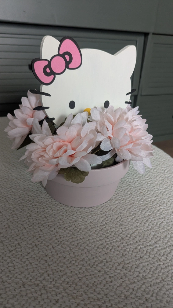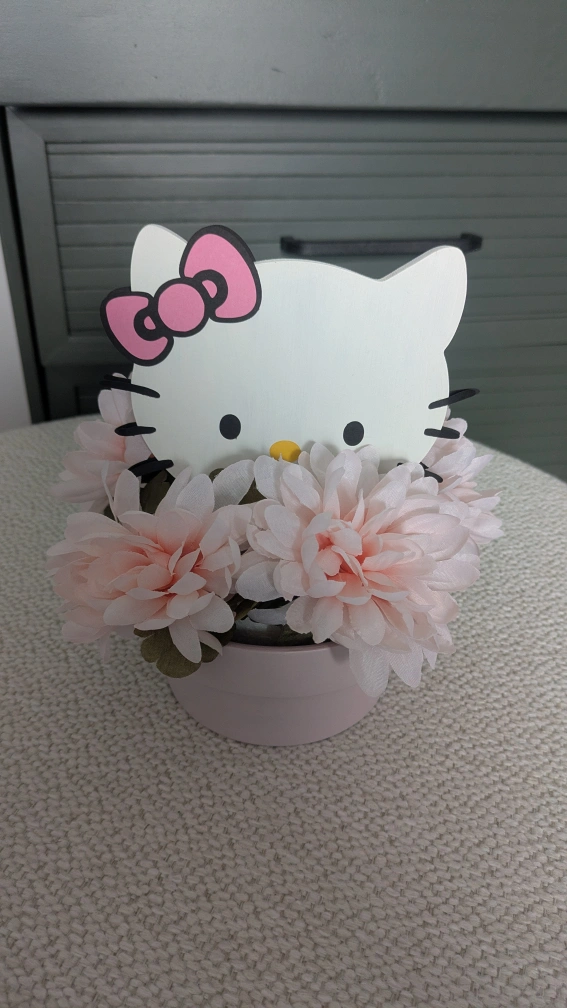 Hello Kitty style flower centrepieces used for a birthday party. Beautiful addition that will add a lot of style to your table scape