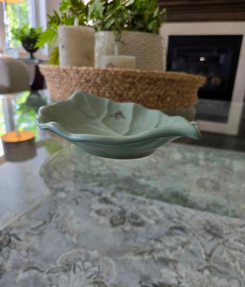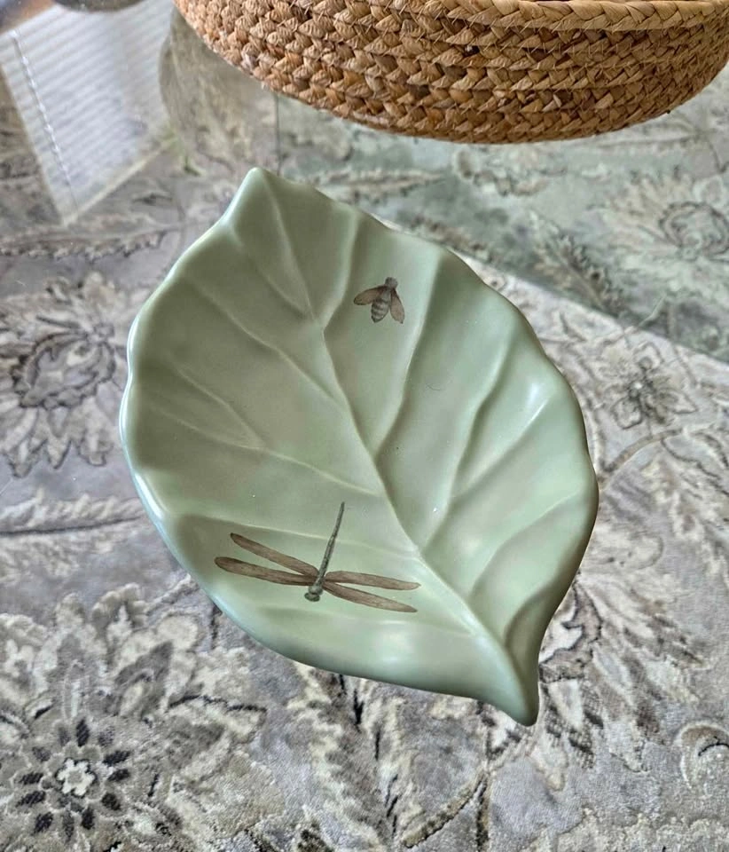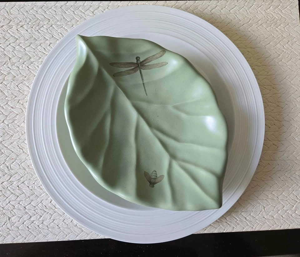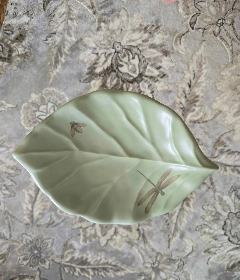 Pfaltzgraff Stoneware Green Leaf Plate With Dragonfly & Bee Pattern, 9” Long. Set Of 12 plates