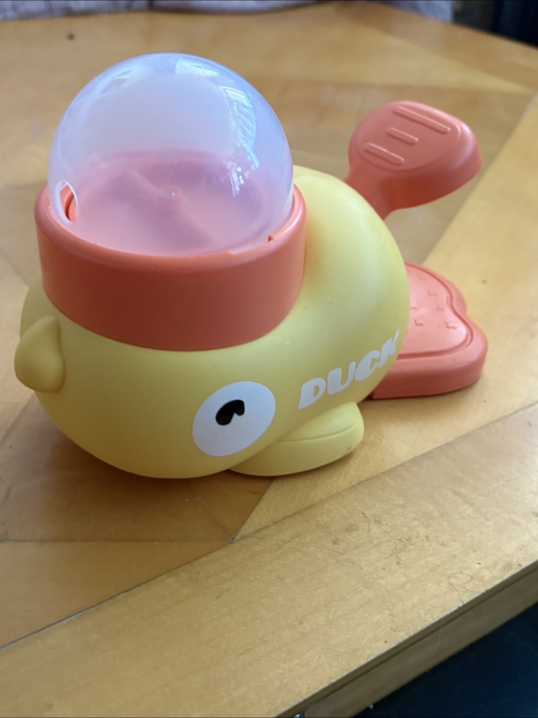 This is a cute yellow duck treat dispenser toy! It's designed to be easy to fill, so you can just pour in pet food and let your furry friend play. The toy encourages your pet to press the handle to release treats, making it a fun and engaging experience for them