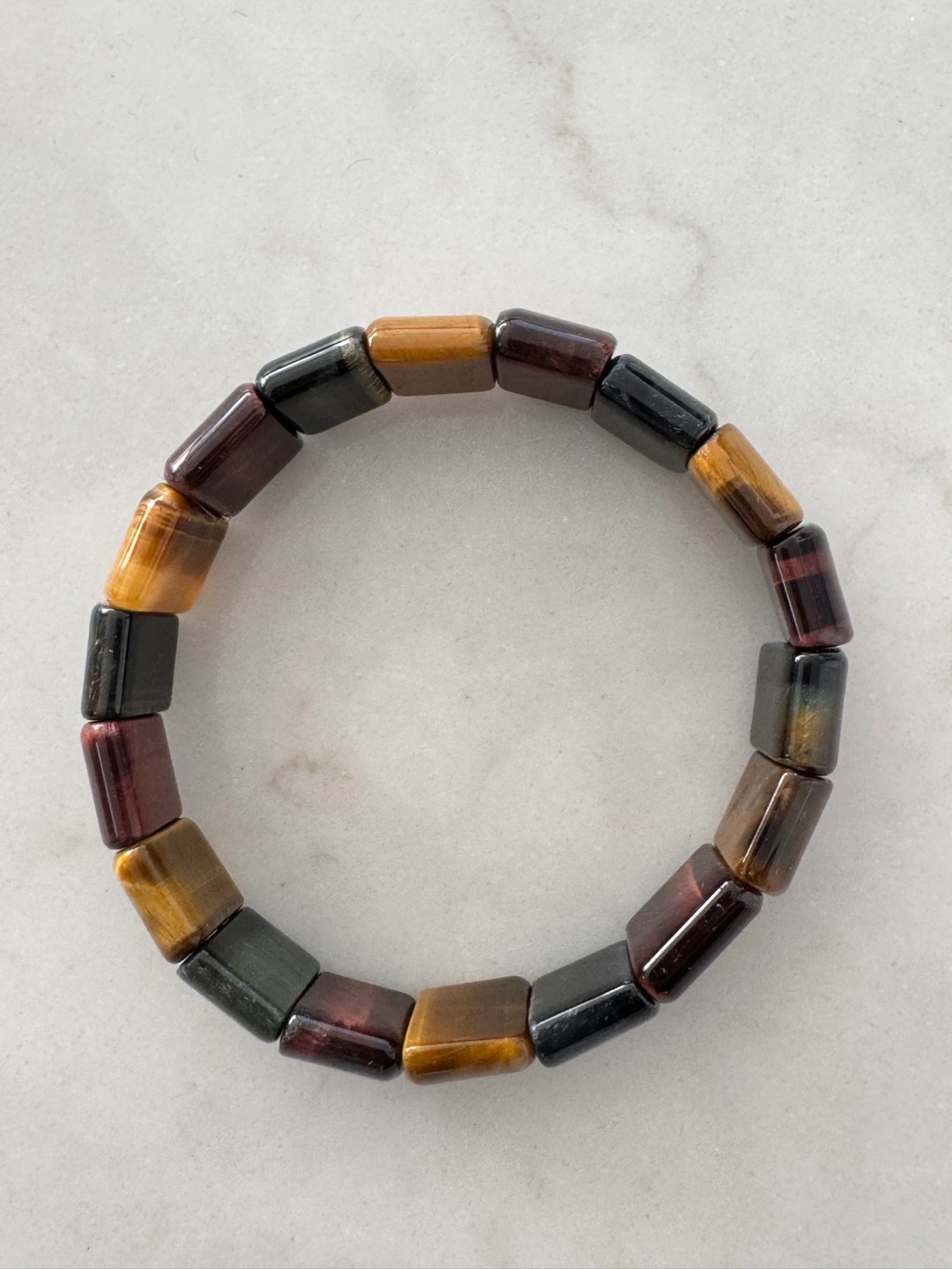 Here's a lovely tiger's eye gemstone bracelet! It features a mix of brown, red, and gold tones. The bracelet is made of rectangular beads and is in great condition, ready to add a touch of natural beauty to your wrist