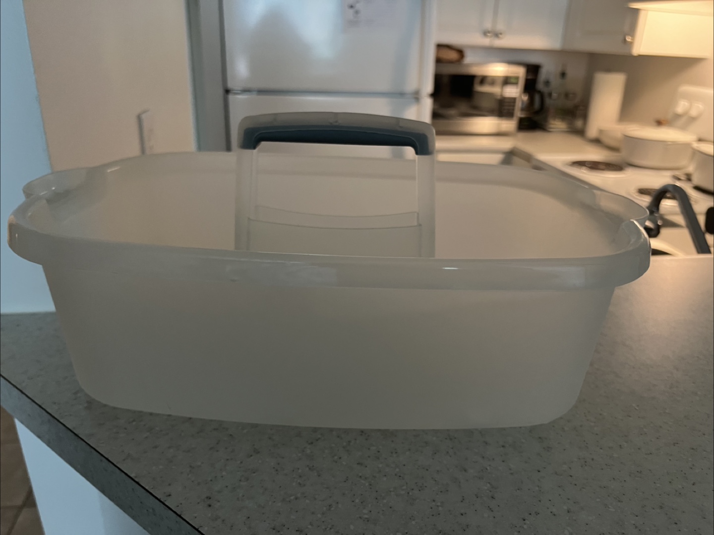 Selling a handy plastic caddy/ storage bin! It's in great shape and perfect for organizing items around the house. It features a convenient handle for easy carrying. Great for tidying up any space!