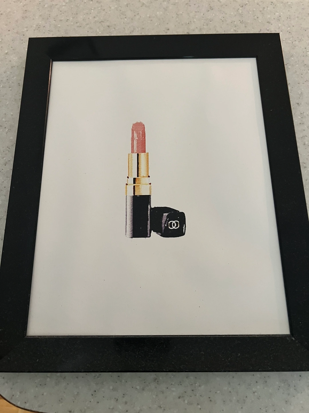 A stylish framed print featuring a Chanel lipstick. The frame is black and the print is in excellent condition, ready to add a touch of elegance to any room. The print is approximately 8x10 inches there is no glass covering.