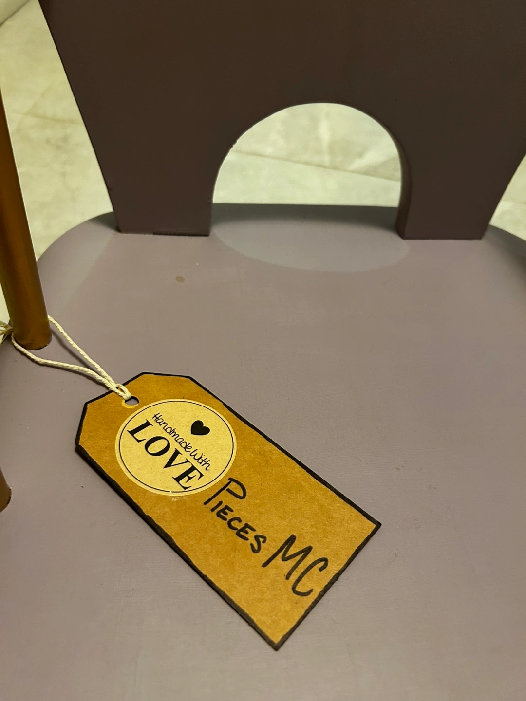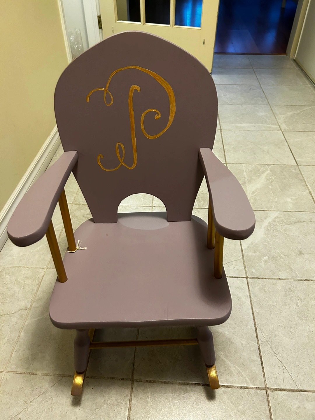 This is a cute, hand-painted rocking chair by Love Pieces MC. It's perfect for a little one to relax and play in. The chair is a lovely purple colour with gold accents. It would make a great addition to any nursery or playroom