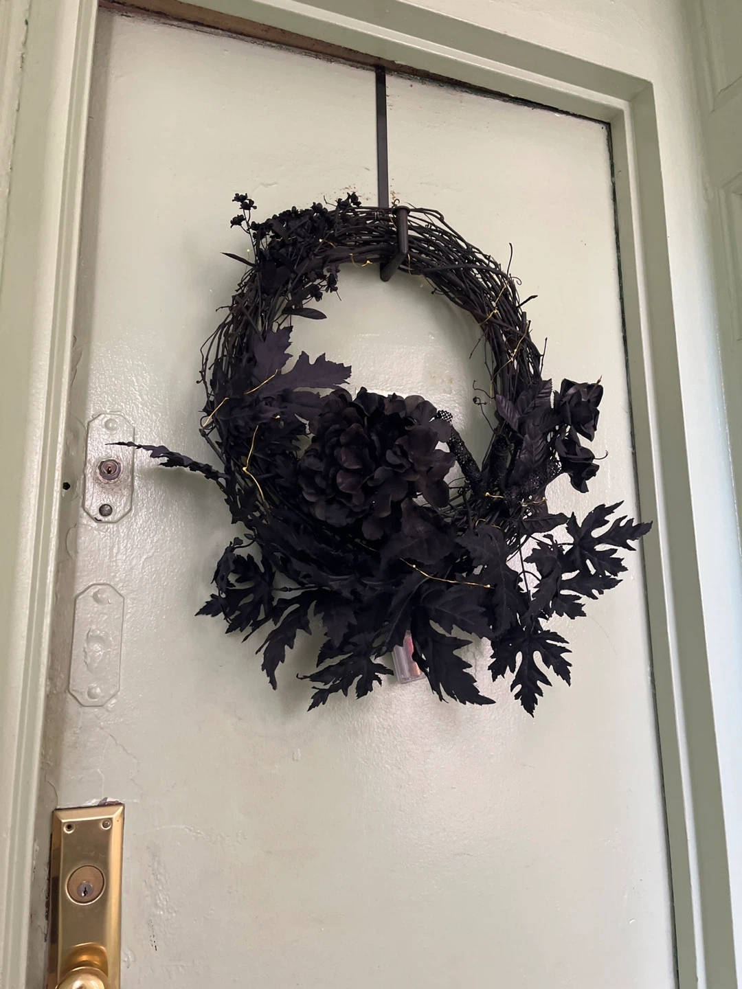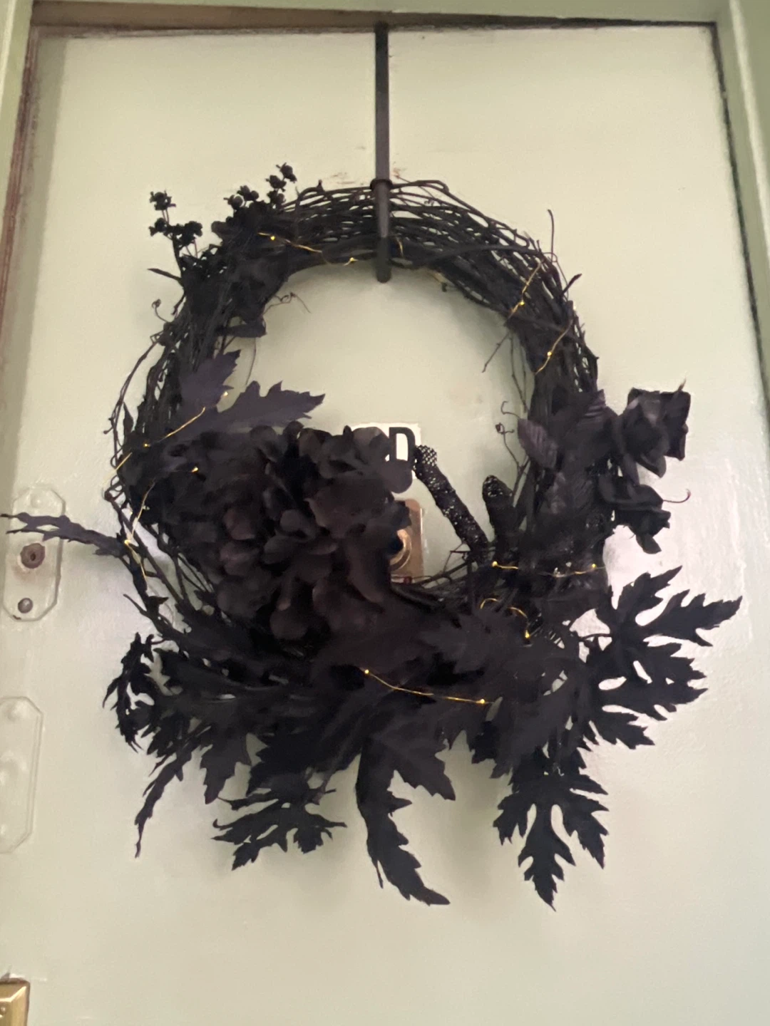 Selling a black decorative wreath. It's in great condition and would look great on any door or wall! It features leaves, flowers, and vine details.