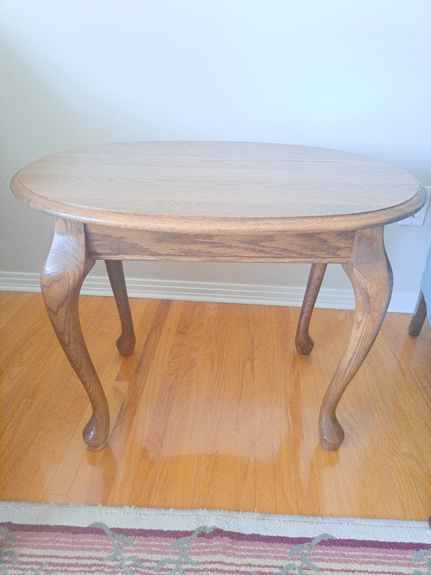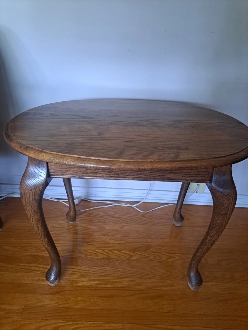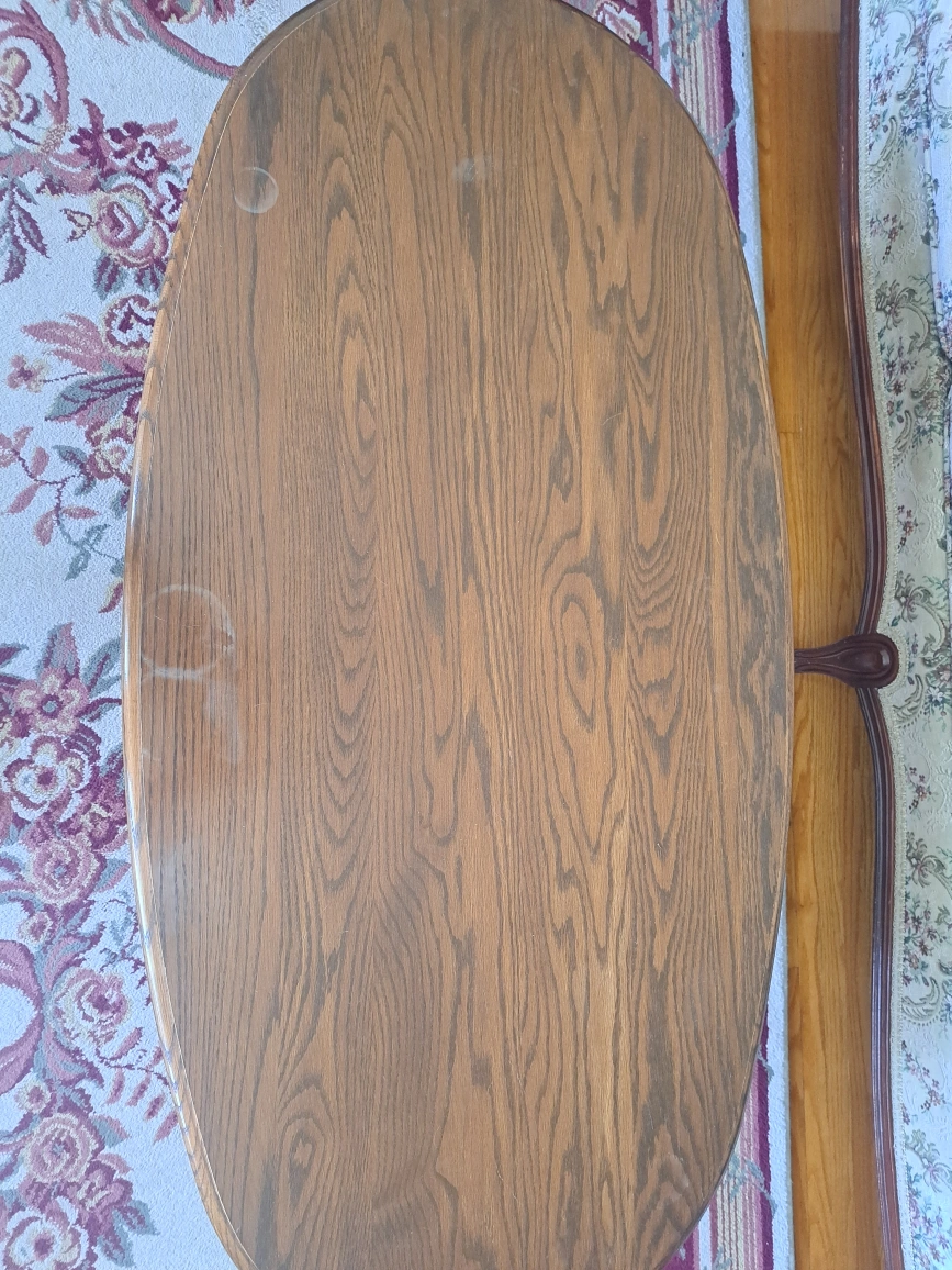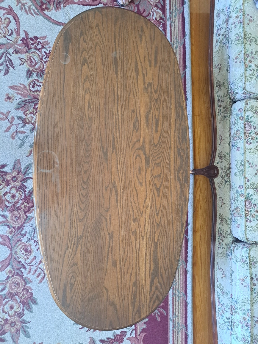 Selling a lovely oval coffee table and 2 side tables with a classic oak finish! It has a beautiful wood grain pattern and sturdy, curved legs. It's perfect for adding a touch of warmth to any living room. There are some signs of use on the coffee table, 2 side tables are in excellent condition but it's still in great shape and ready for a new home