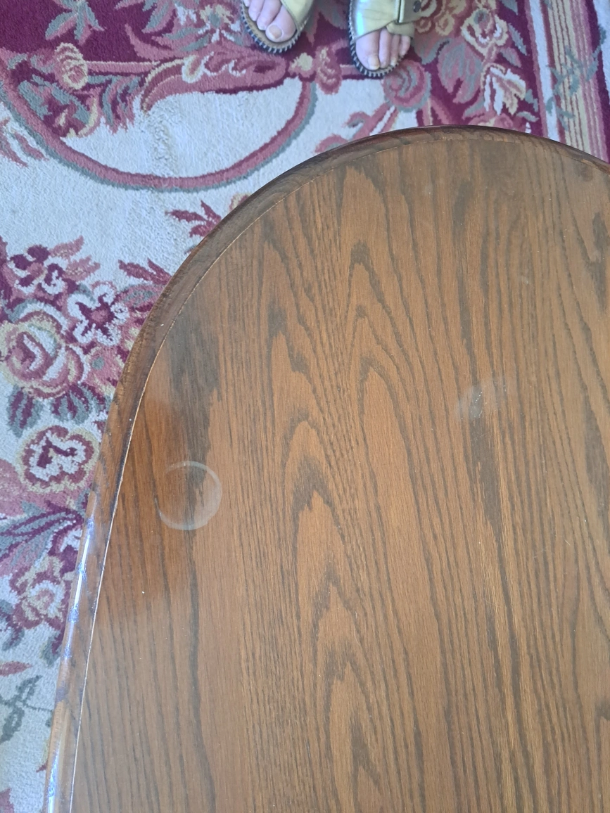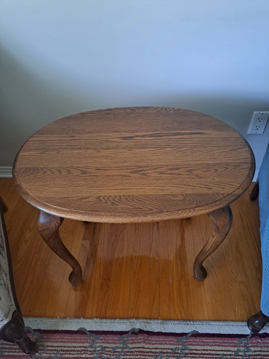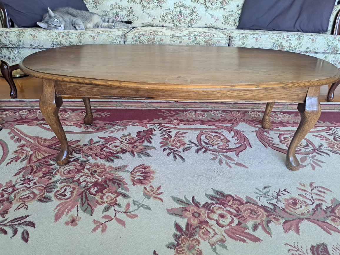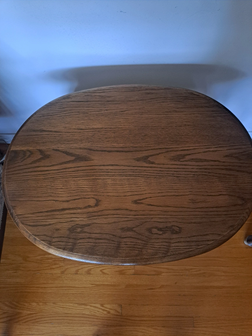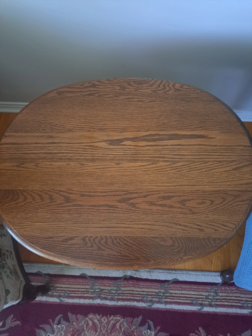 Selling a lovely oval coffee table and 2 side tables with a classic oak finish! It has a beautiful wood grain pattern and sturdy, curved legs. It's perfect for adding a touch of warmth to any living room. There are some signs of use on the coffee table, 2 side tables are in excellent condition but it's still in great shape and ready for a new home