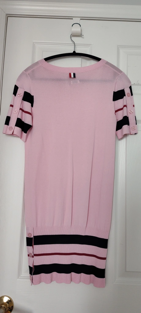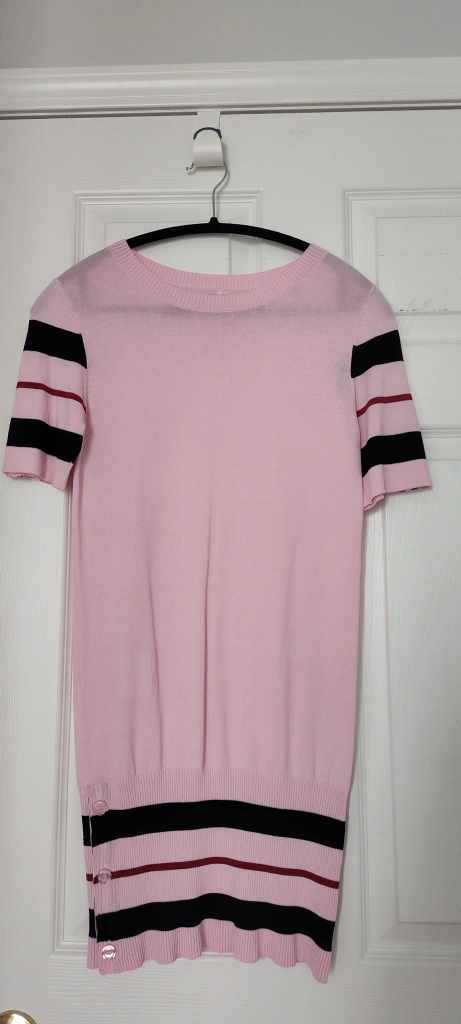 1000+A cute pink knit dress with black and burgundy stripes on the sleeves and hem! Features button details on the sleeves and side. Made in Japan.