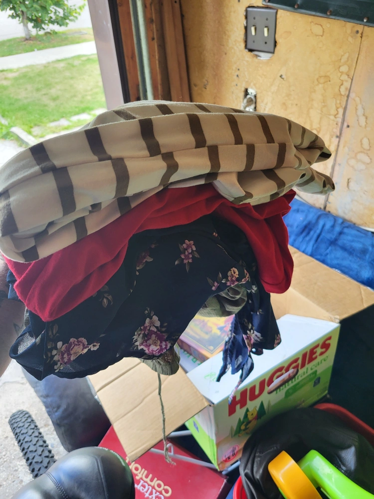 Selling a bundle of assorted women's clothing. Includes a striped top, a red sweater, and a floral dress. Perfect for expanding your wardrobe! we'll 2 pants suits and a dress and one shirt 10 for all size large