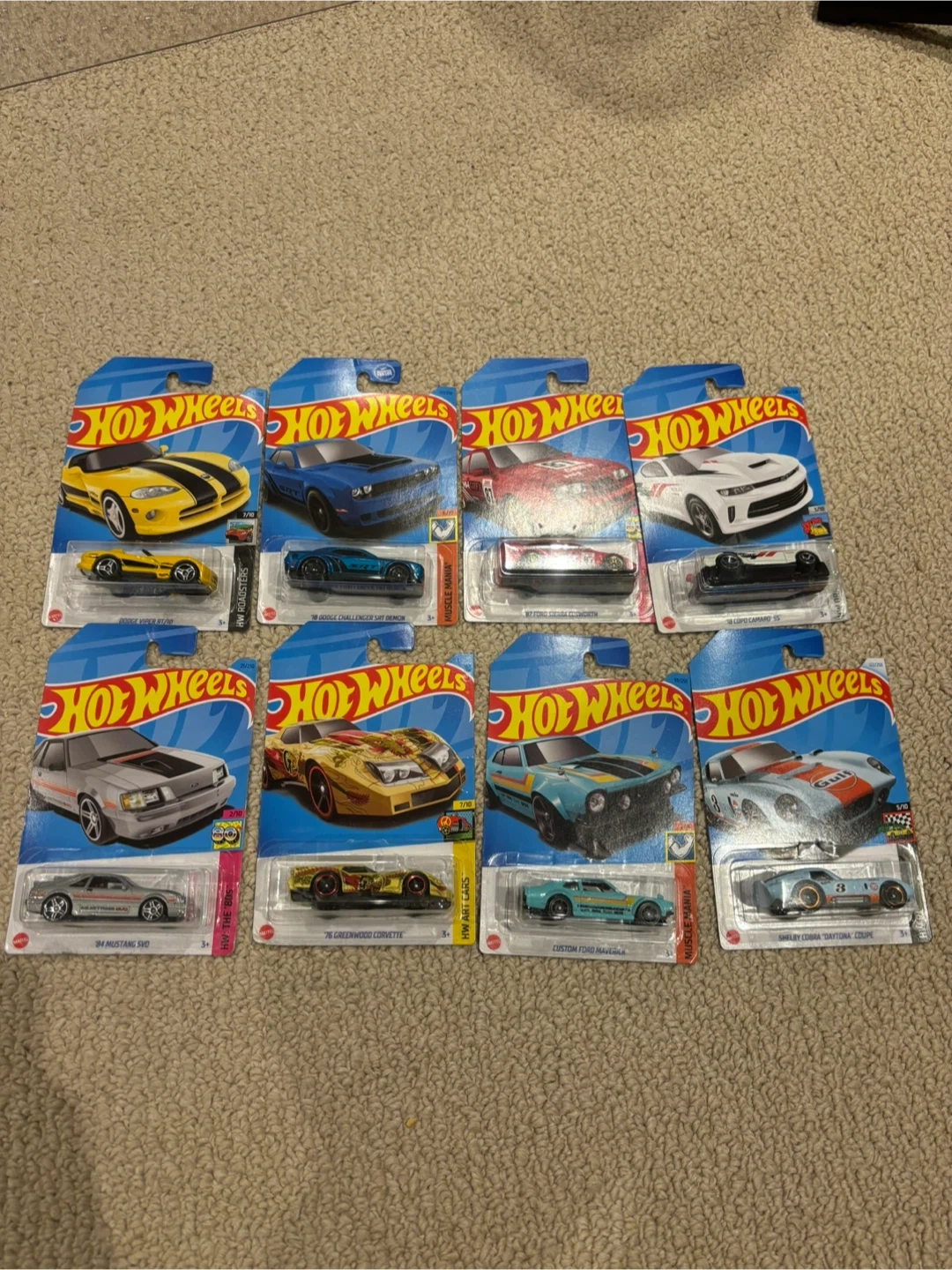 Selling a collection of Hot Wheels diecast cars! All are still in their original packaging. Models include: - Dodge Viper RT/10 - '18 Dodge Challenger SRT Demon - '67 Ford Sierra Cosworth - '18 Copo Camaro - '84 Mustang SVO - '76 Greenwood Corvette - Custom Ford Maverick - Shelby Cobra Daytona Coupe Asking $4 each or 3 for $10