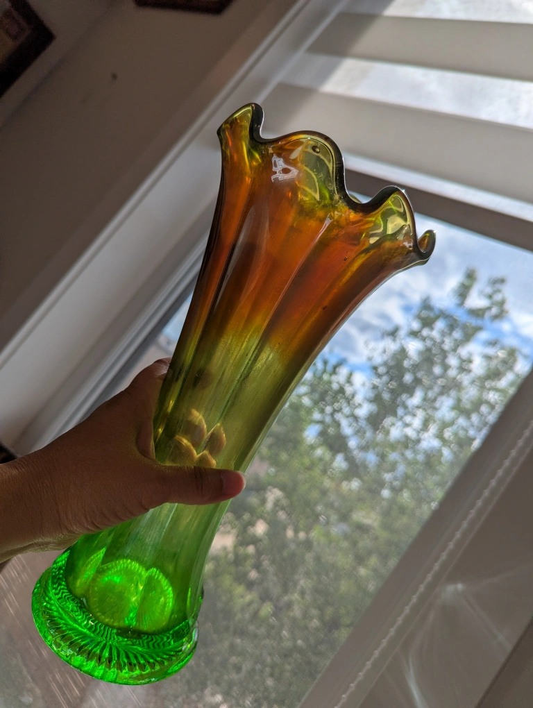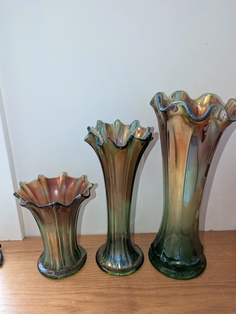 I'm selling a set of three beautiful iridescent green glass vases. They have a unique ruffled edge and a lovely shimmer in the light. The first two are thin rib and the third is a flute or wide panel. 6, 10 and 12 inches tall.