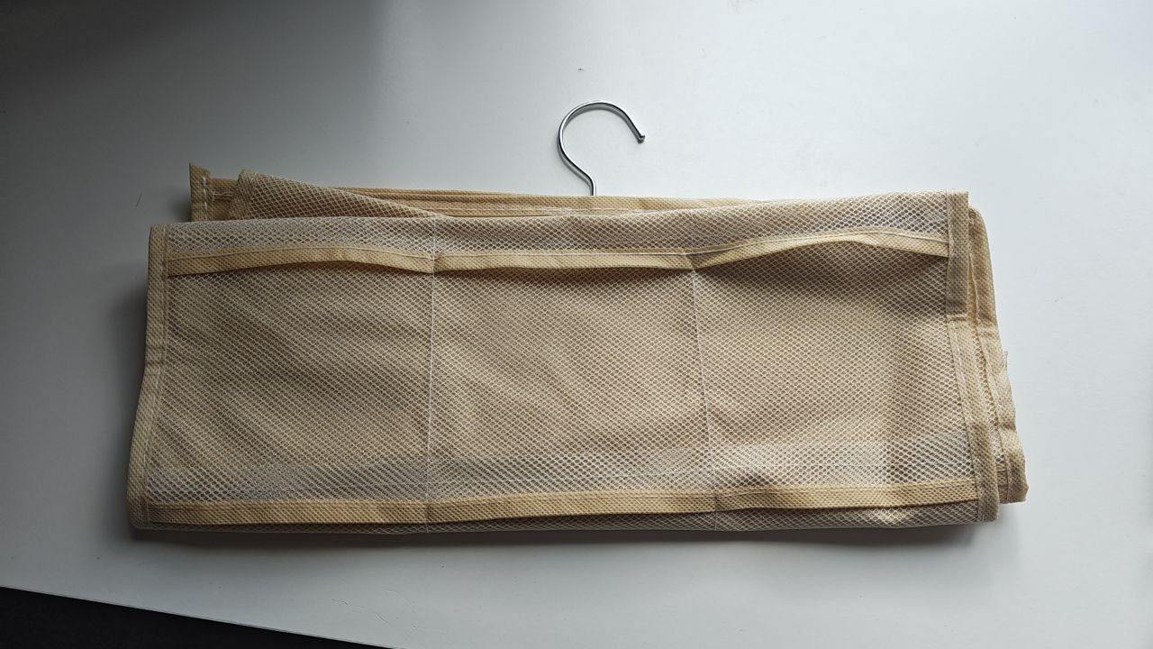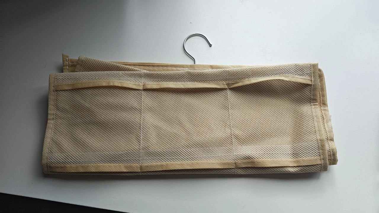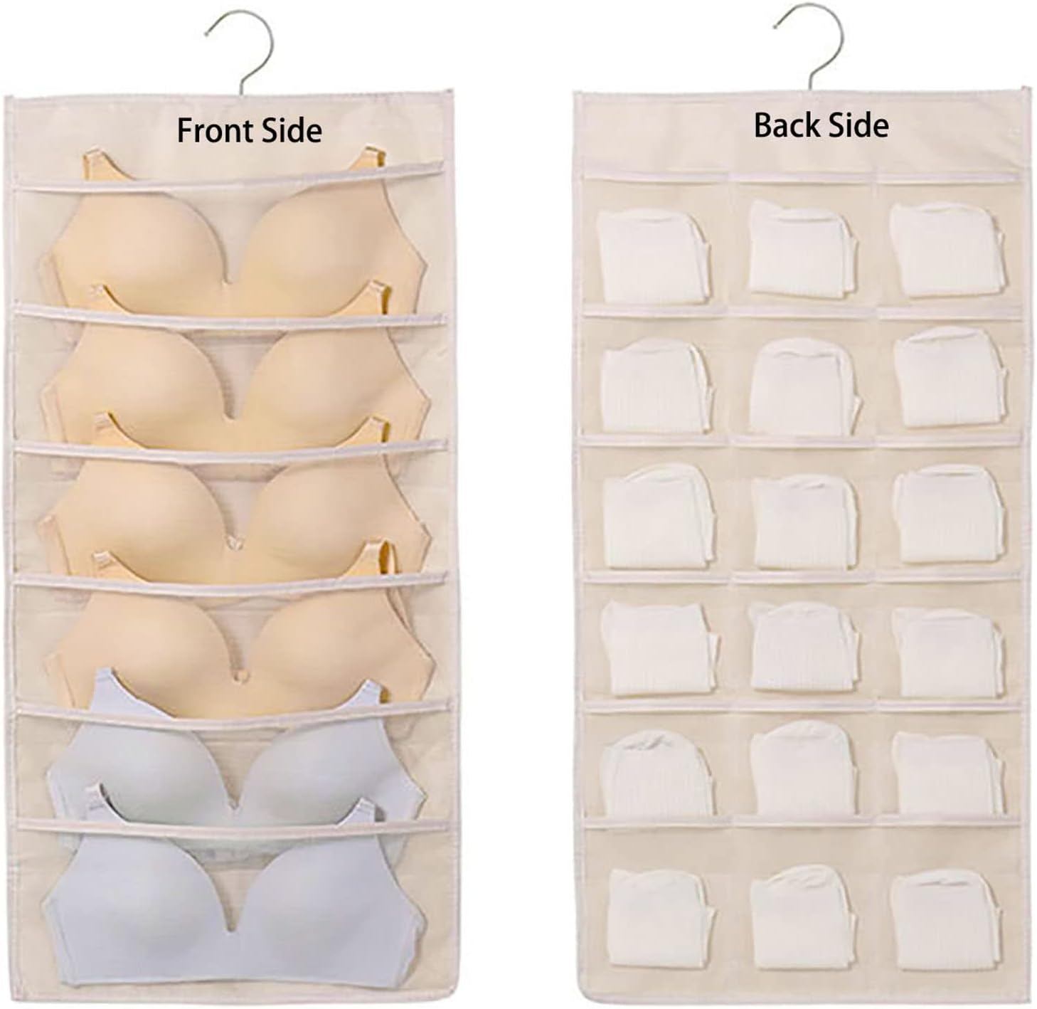 Set of 2 hanging closet organizers with 24 pockets each. Perfect for bras, socks, underwear, or accessories. Double-sided design with a rotating hanger hook for easy use.
