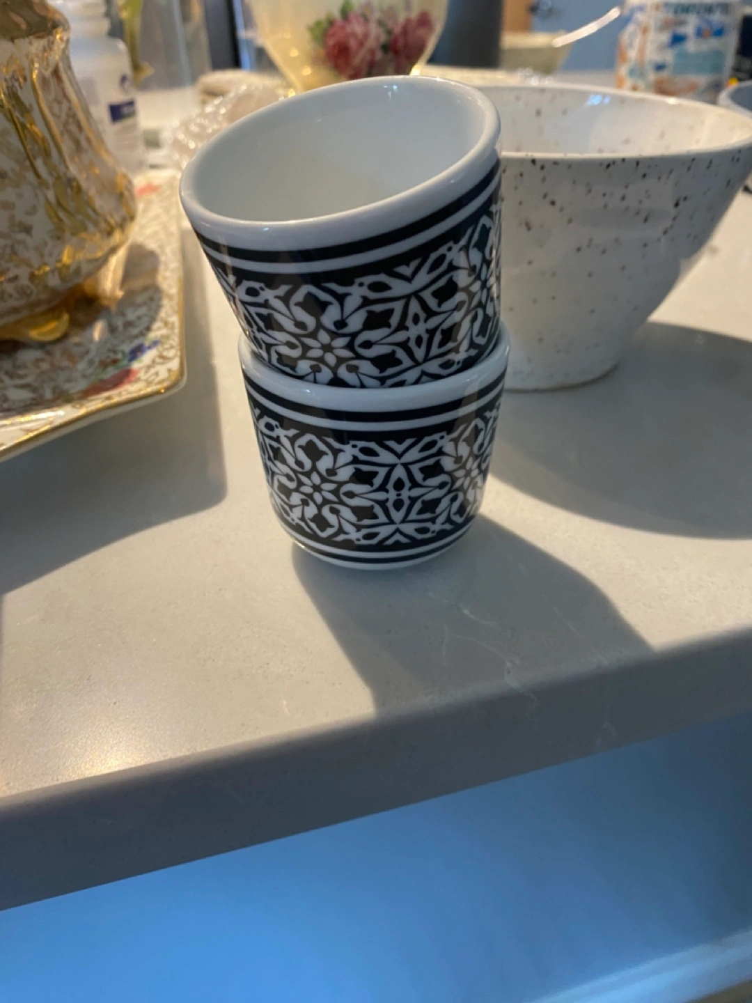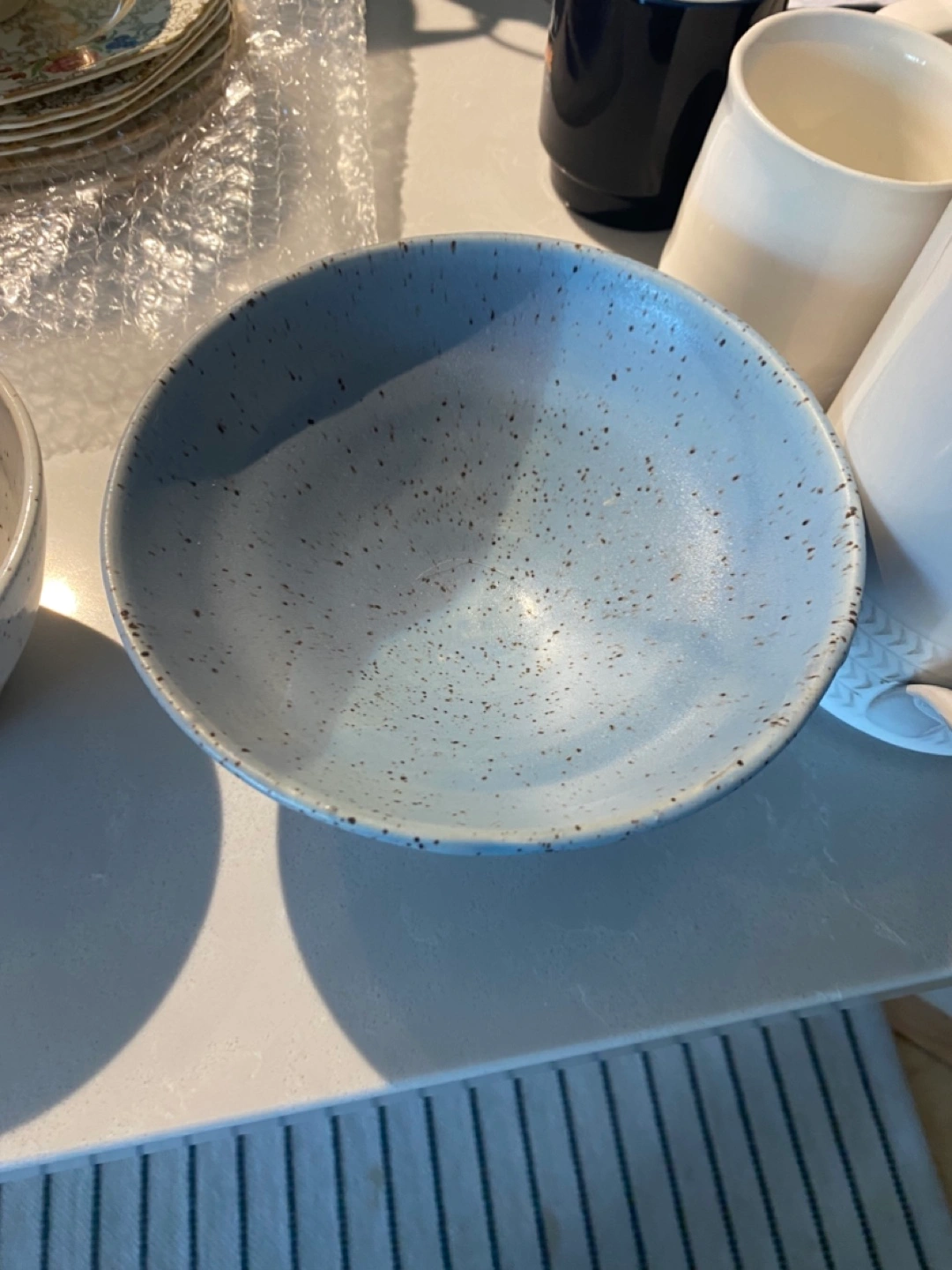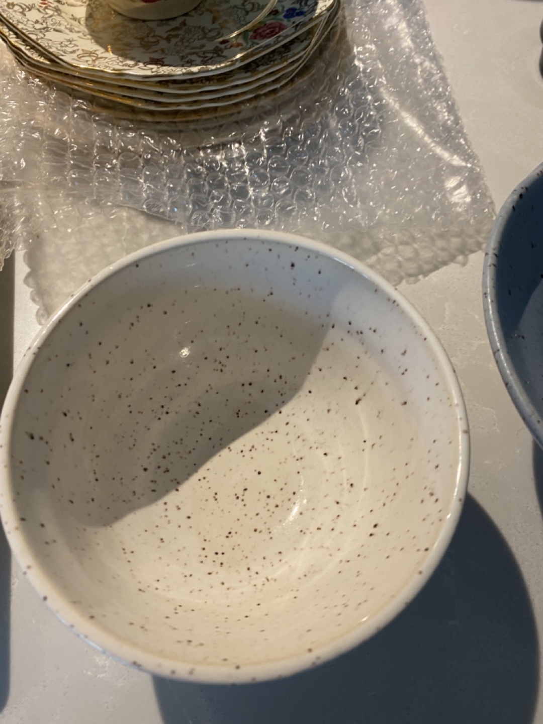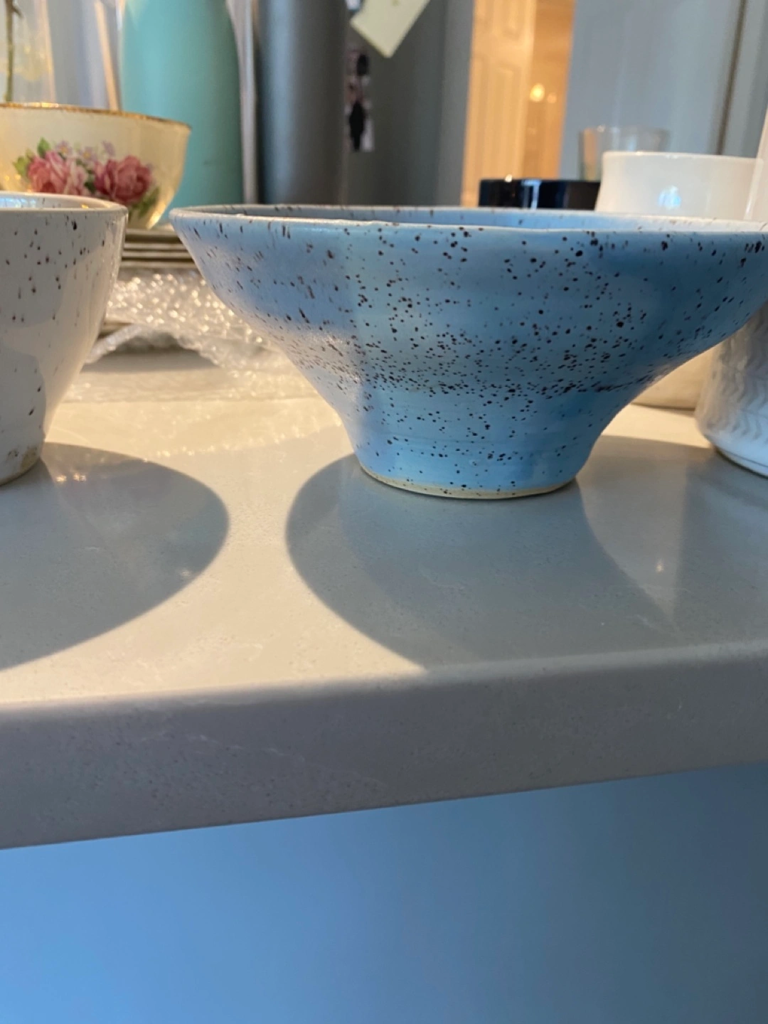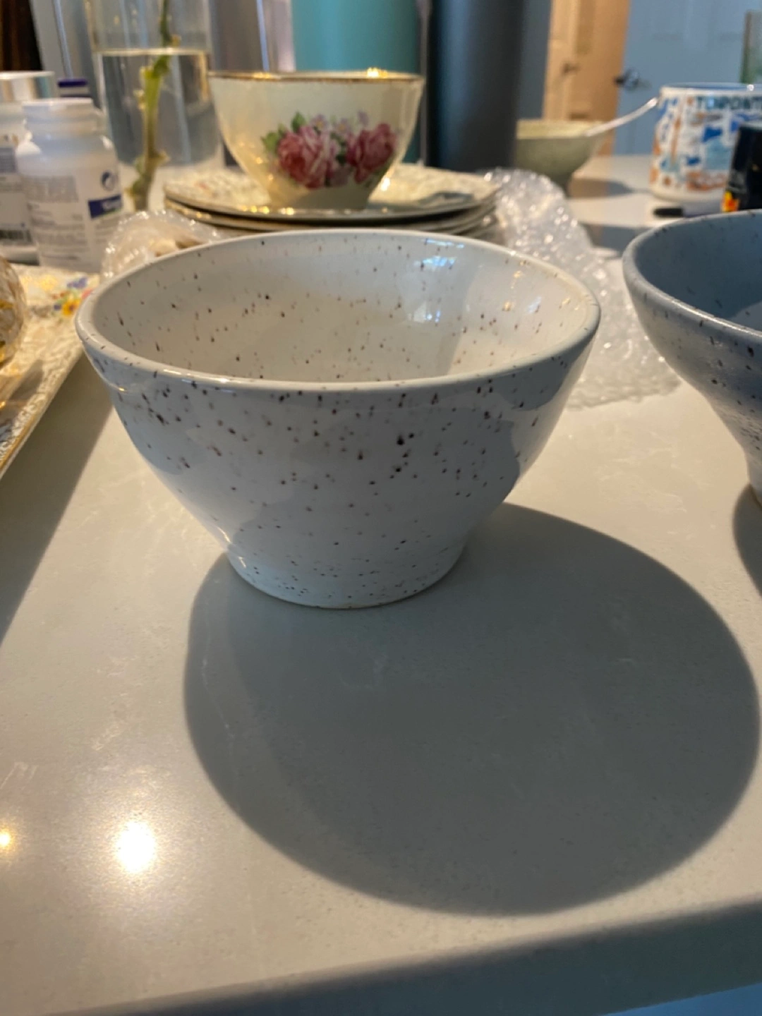 Just getting rid of a few random kitchen things! two speckled ceramic bowls. One is a lovely light blue and the other is white with brown speckles. They're in great condition and would be a nice addition to any kitchen!