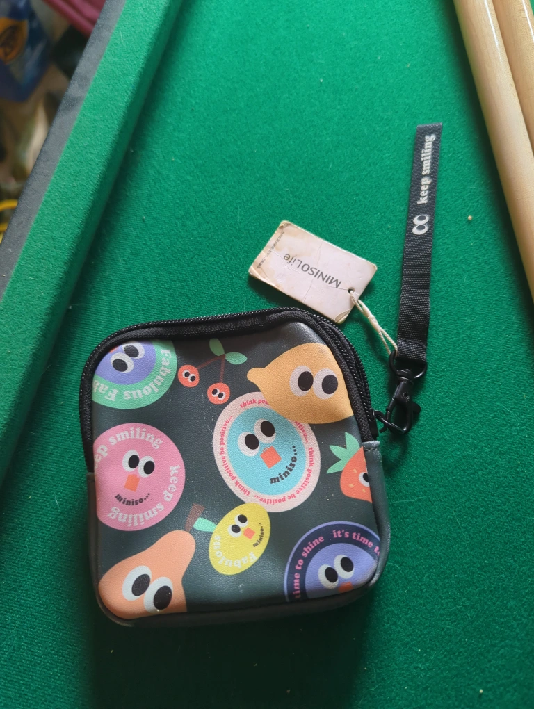 Super cute Miniso coin purse! It's perfect for keeping your change, cards, or small trinkets organized. The design is adorable with colourful fruit characters and the little strap says "keep smiling"! Compact and easy to carry, it's a great addition to your bag or pocket