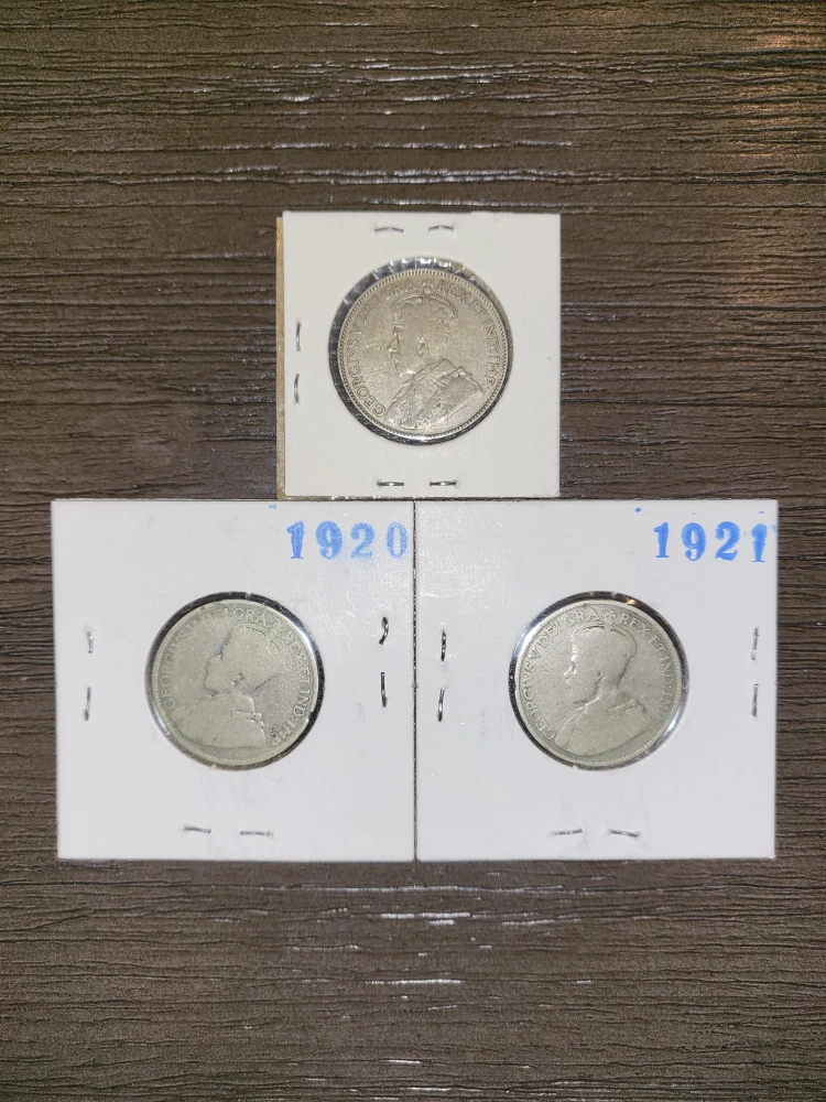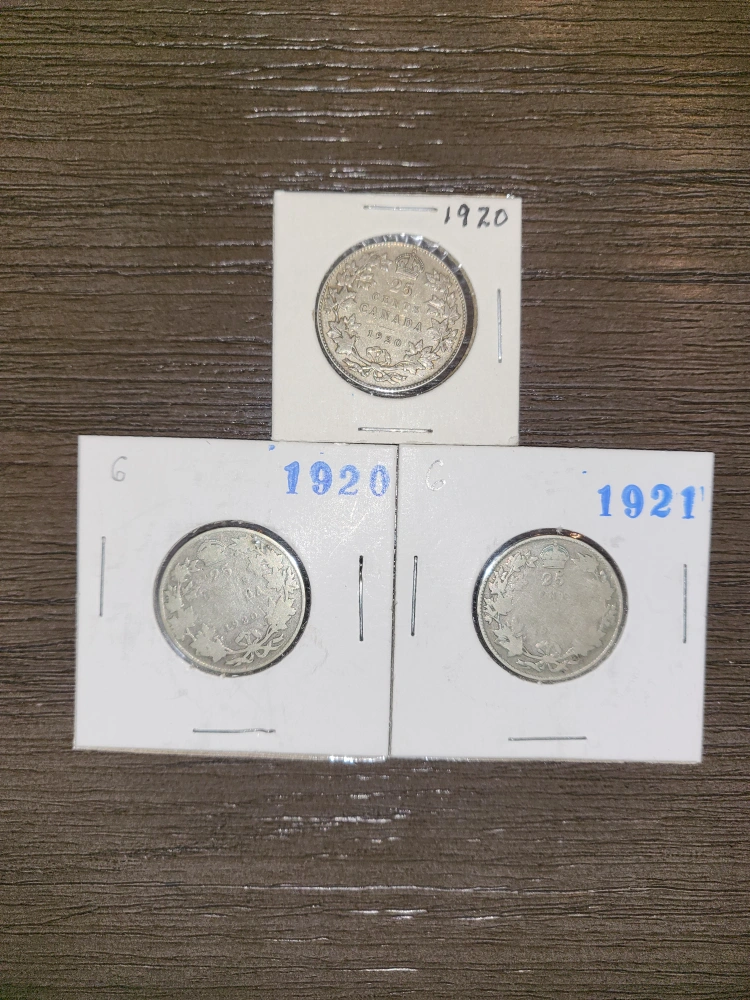 Collection of vintage Canadian 25 cent coins. Coins from 1920 and 1921. Great for collectors or anyone interested in Canadian history.