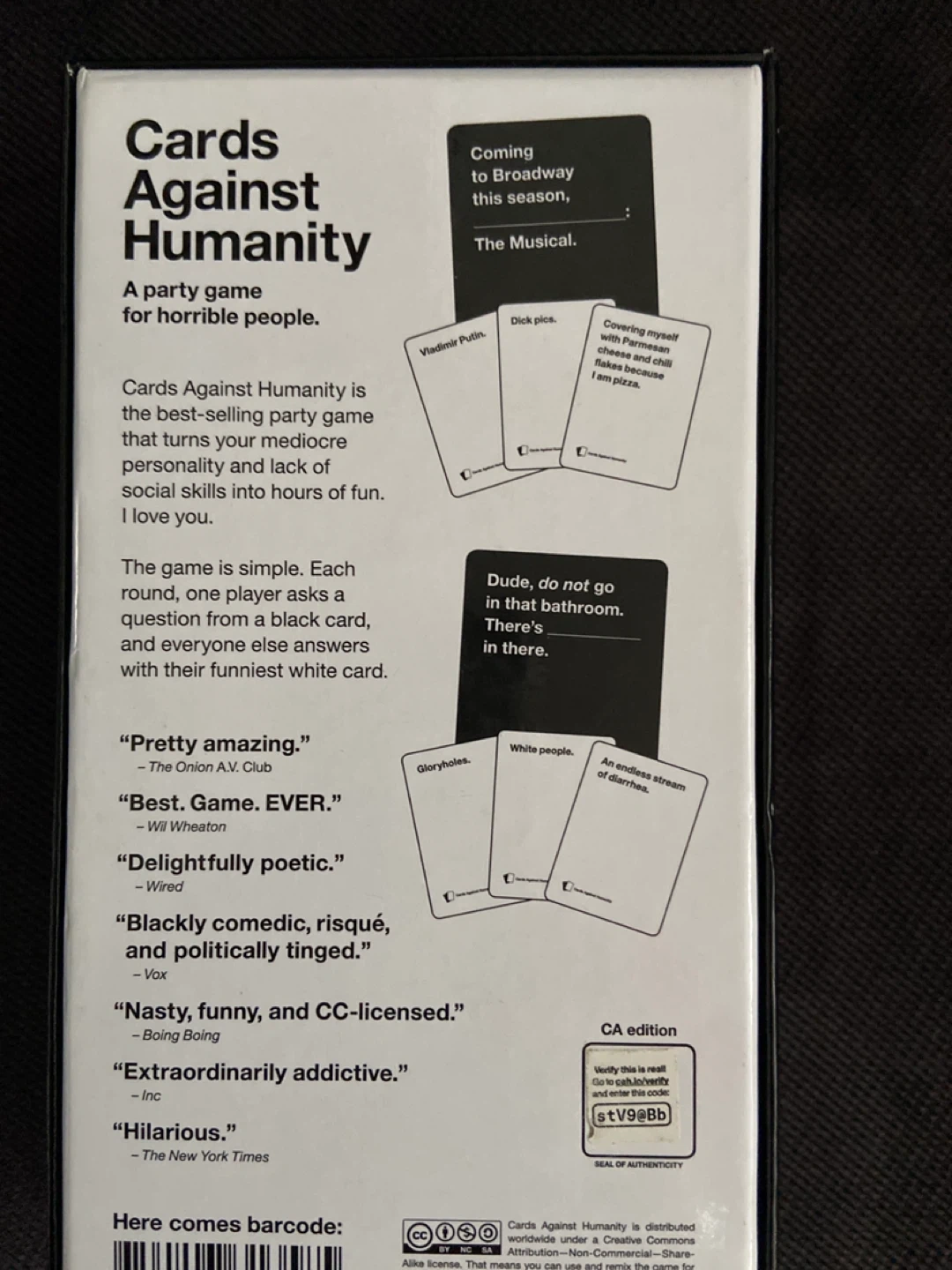 Selling a Cards Against Humanity game, CA edition! It's a party game for horrible people, sure to bring some laughs. The box is included, and the game is in great shape!