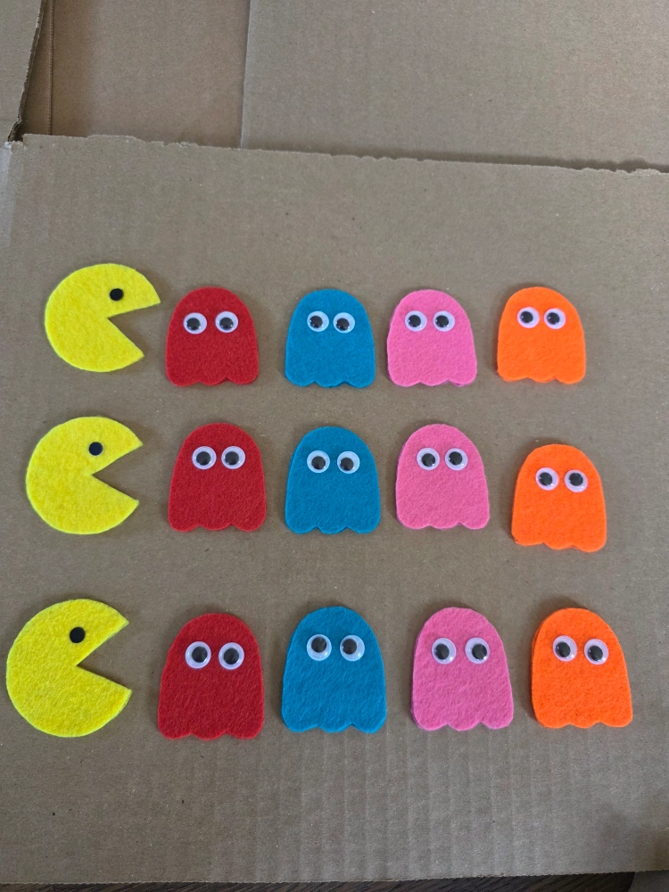 Pac-Man and ghosts felt patches with googly eyes. Size shown in photos.