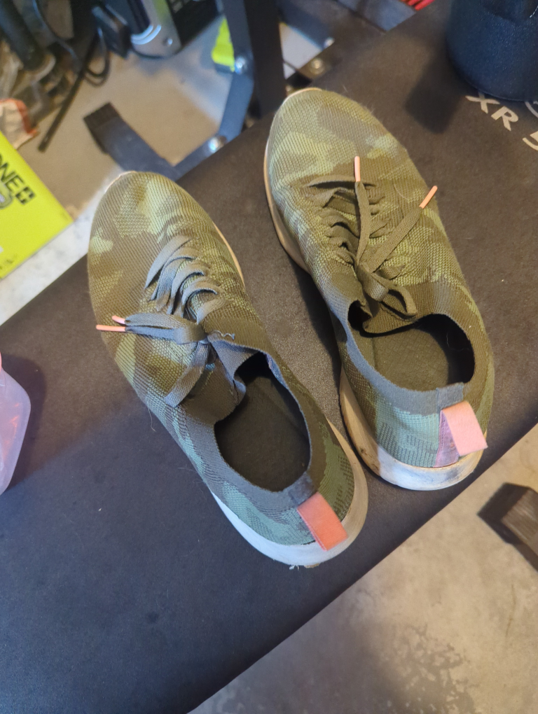 Selling a pair of gently used running shoes in an olive green camouflage pattern. They're lightweight and comfortable, perfect for everyday wear or hitting the pavement! They have a unique knit texture and a sporty look