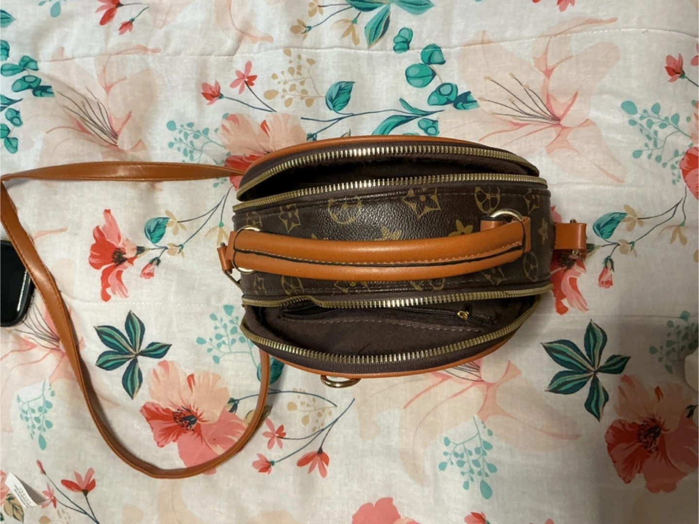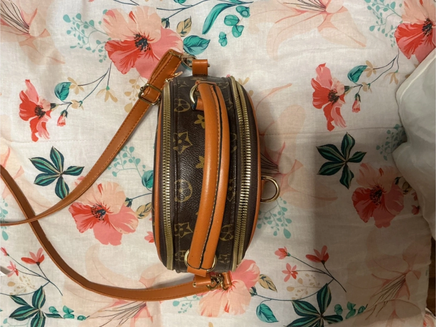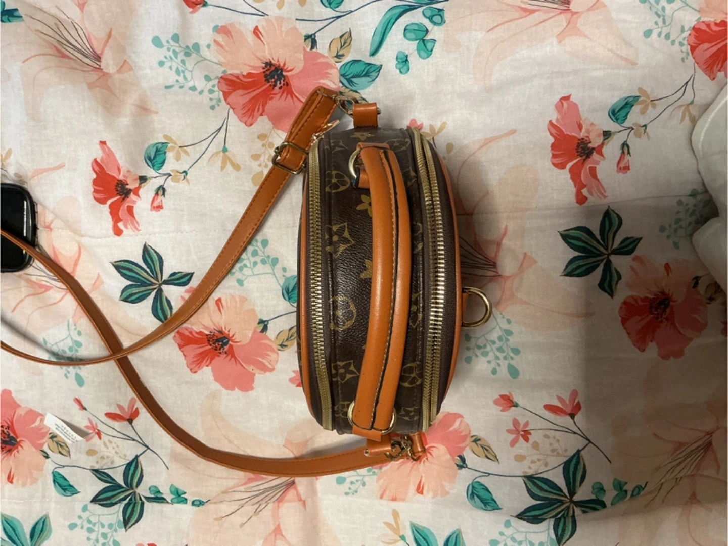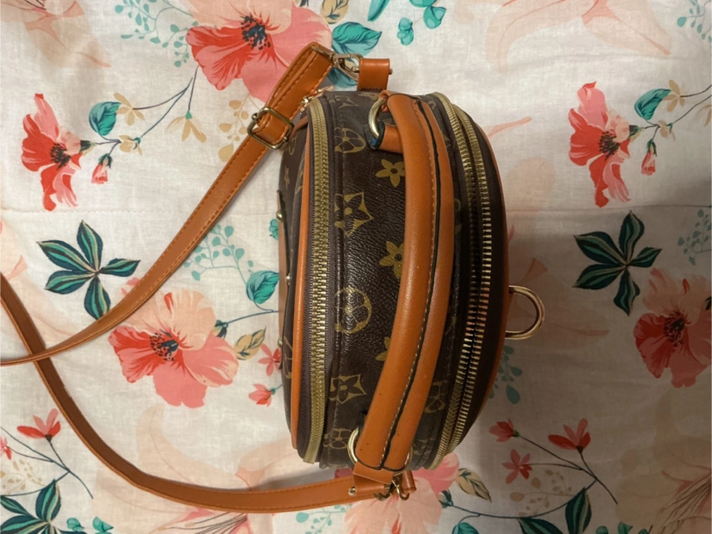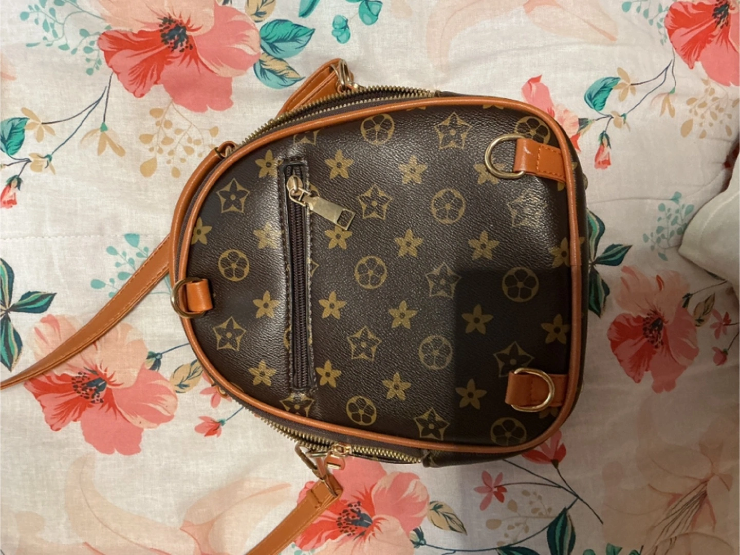 This cute mini backpack features a brown patterned design with tan accents. It's perfect for carrying your essentials in style!