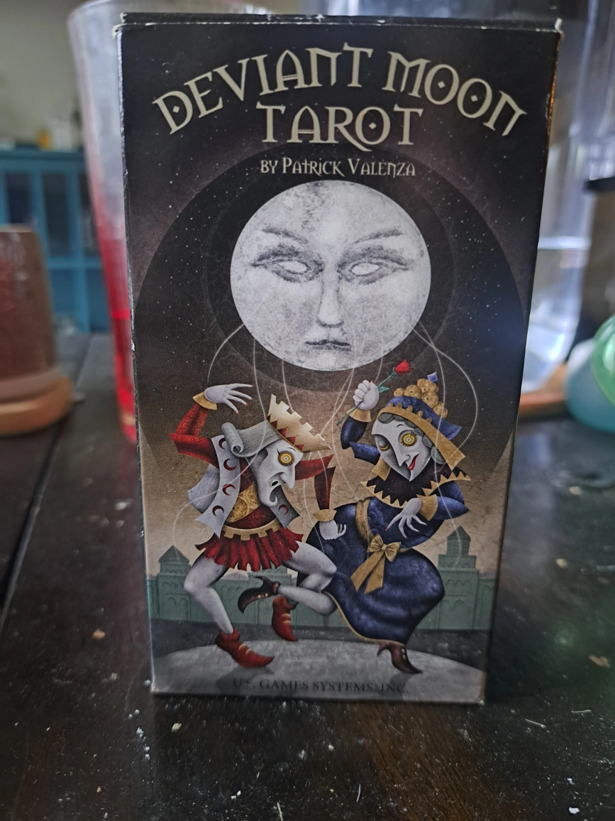 Selling a Deviant Moon Tarot deck by Patrick Valenza. It's a unique and visually striking tarot set, perfect for collectors or those looking for a different perspective in their readings. The deck comes in its original box, ready for a new home!