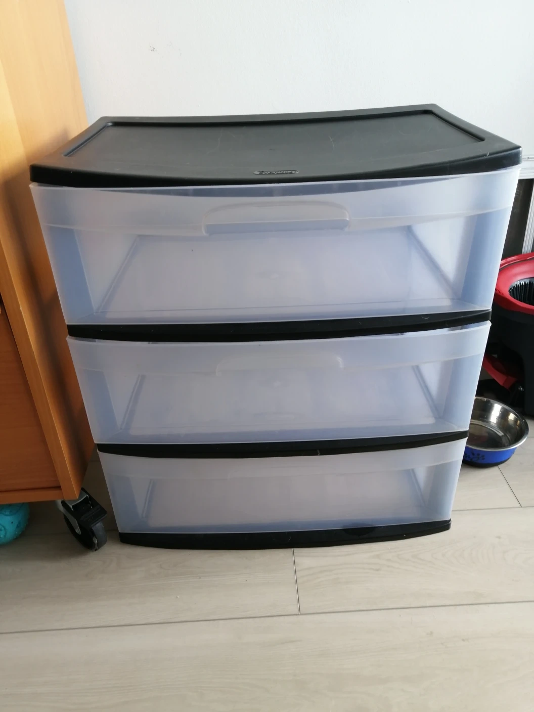 Selling a Sterilite 3-drawer wide weave tower. It's in great condition and perfect for extra storage around the house.