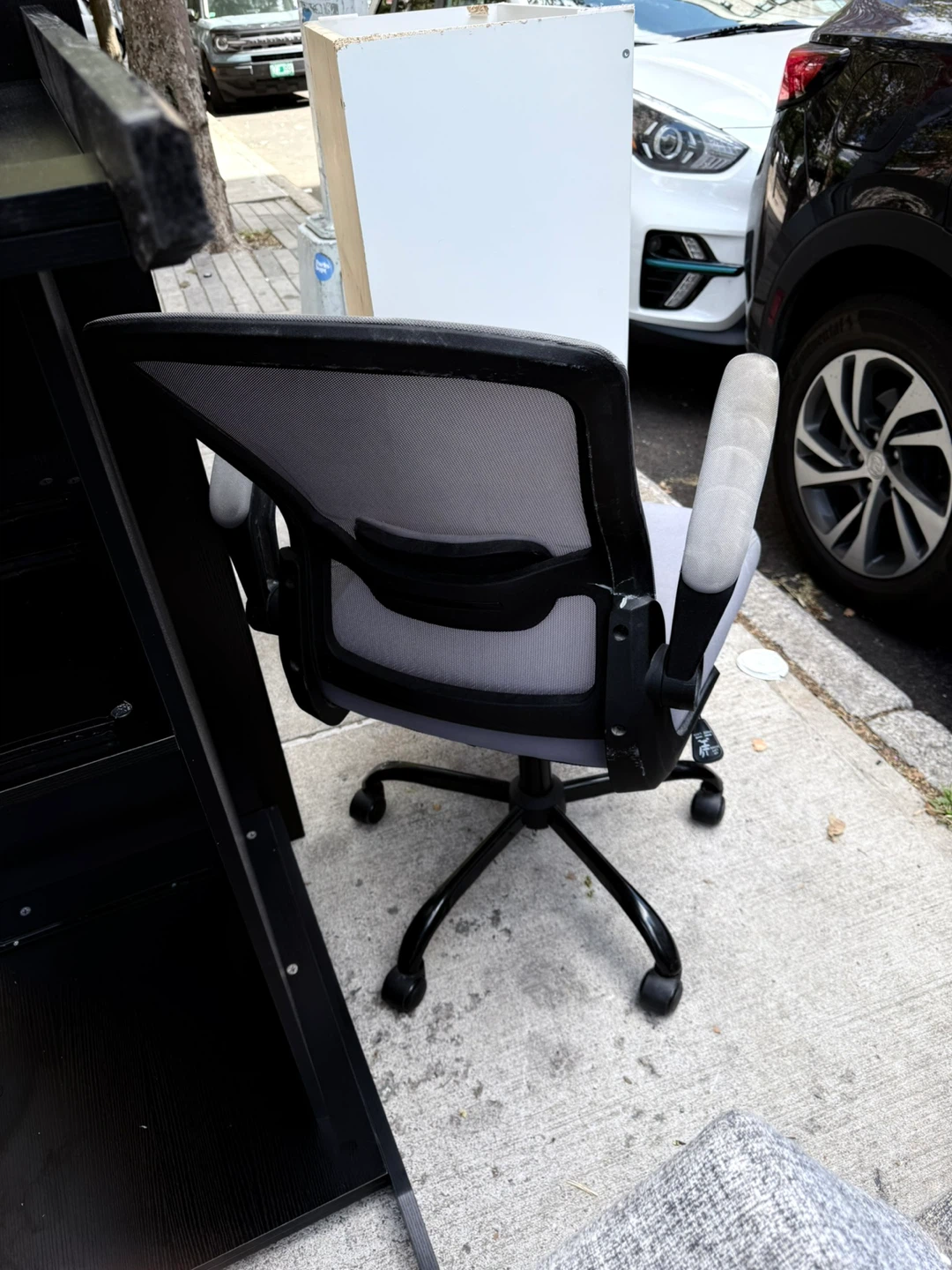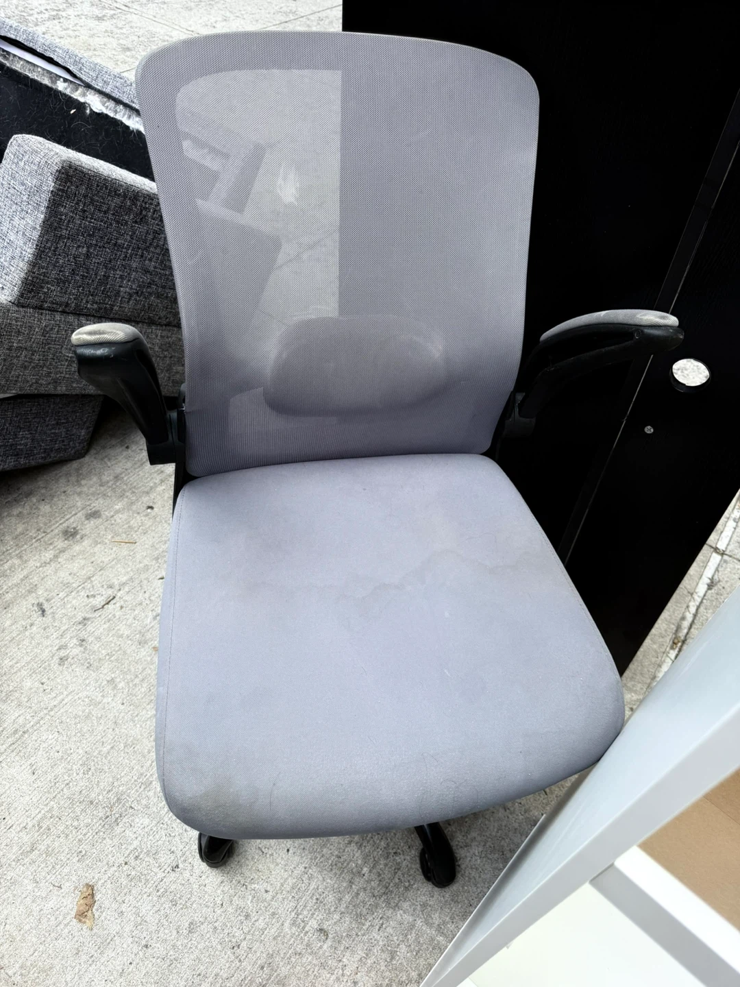 Free used office chair in gray. It shows some signs of wear, as seen in the photos, but it's still functional. Perfect for a home office or study space!