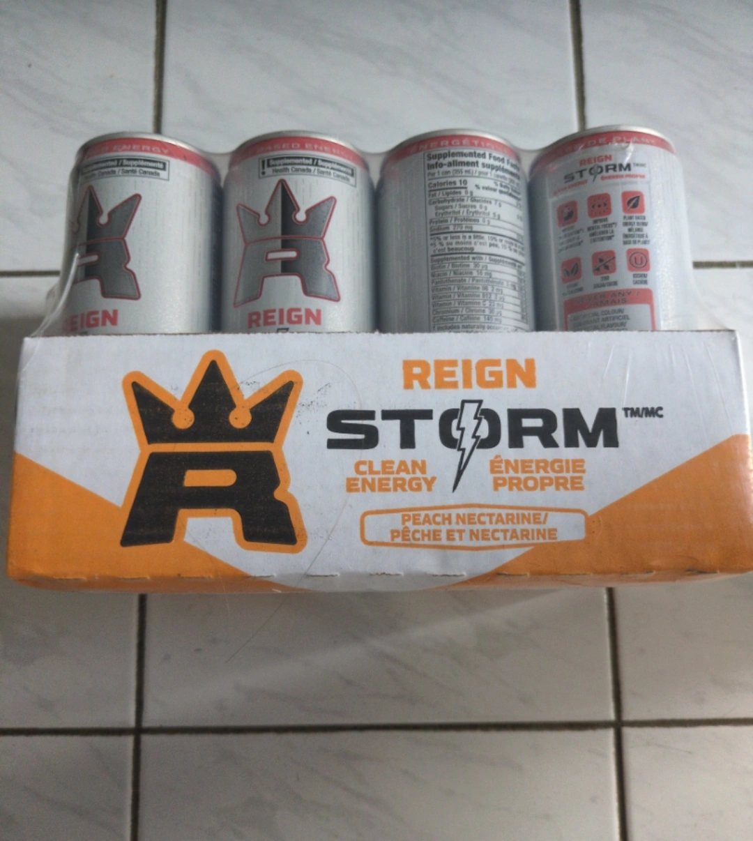 Selling a 12-pack of Reign Storm Clean Energy Peach Nectarine drinks! It's perfect for a little boost.