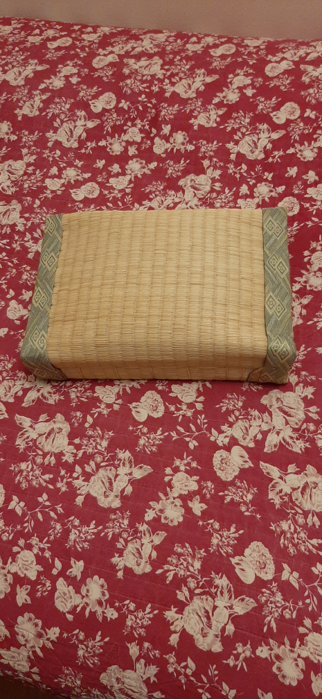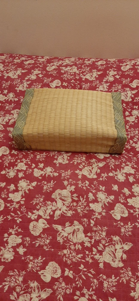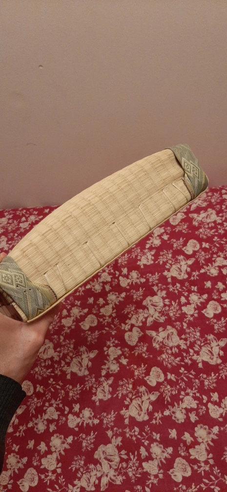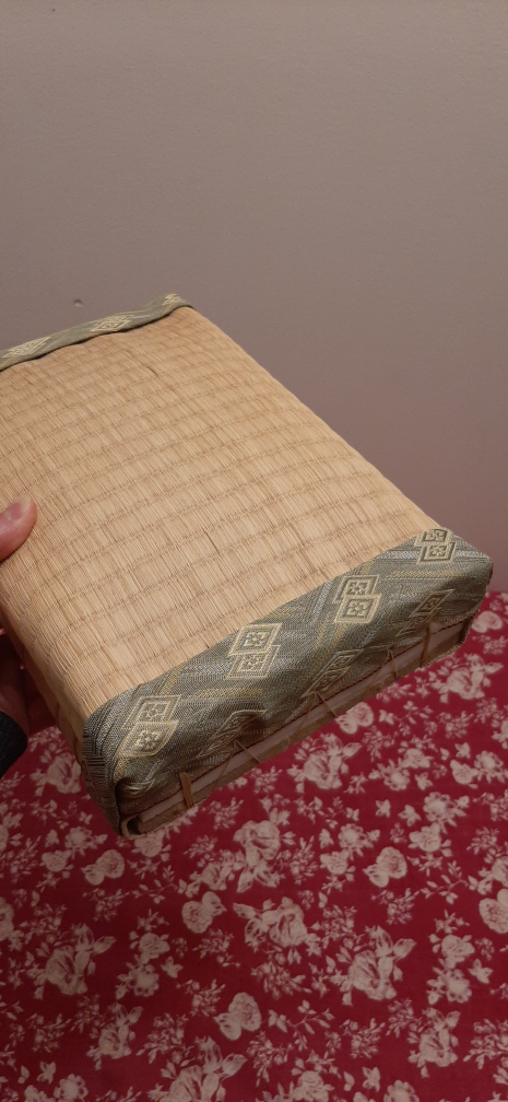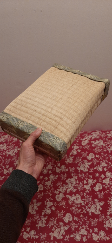 Giving a woven tatami mat. It's in great shape and would be perfect for adding a touch of Japanese style to your home. The mat has a natural, woven texture and a decorative border. It's a versatile piece that can be used as a seat cushion or floor mat