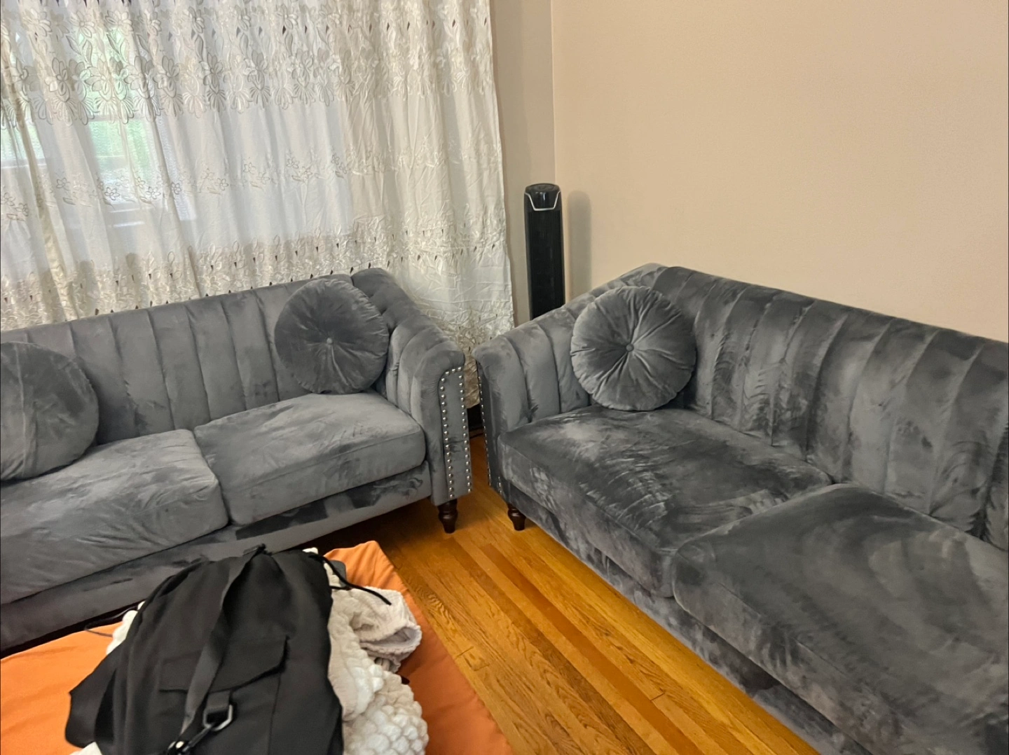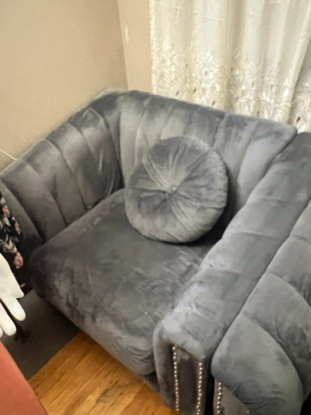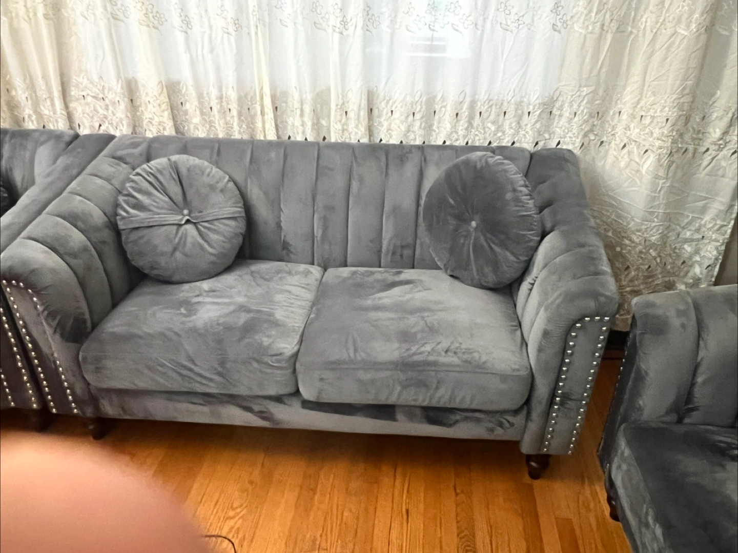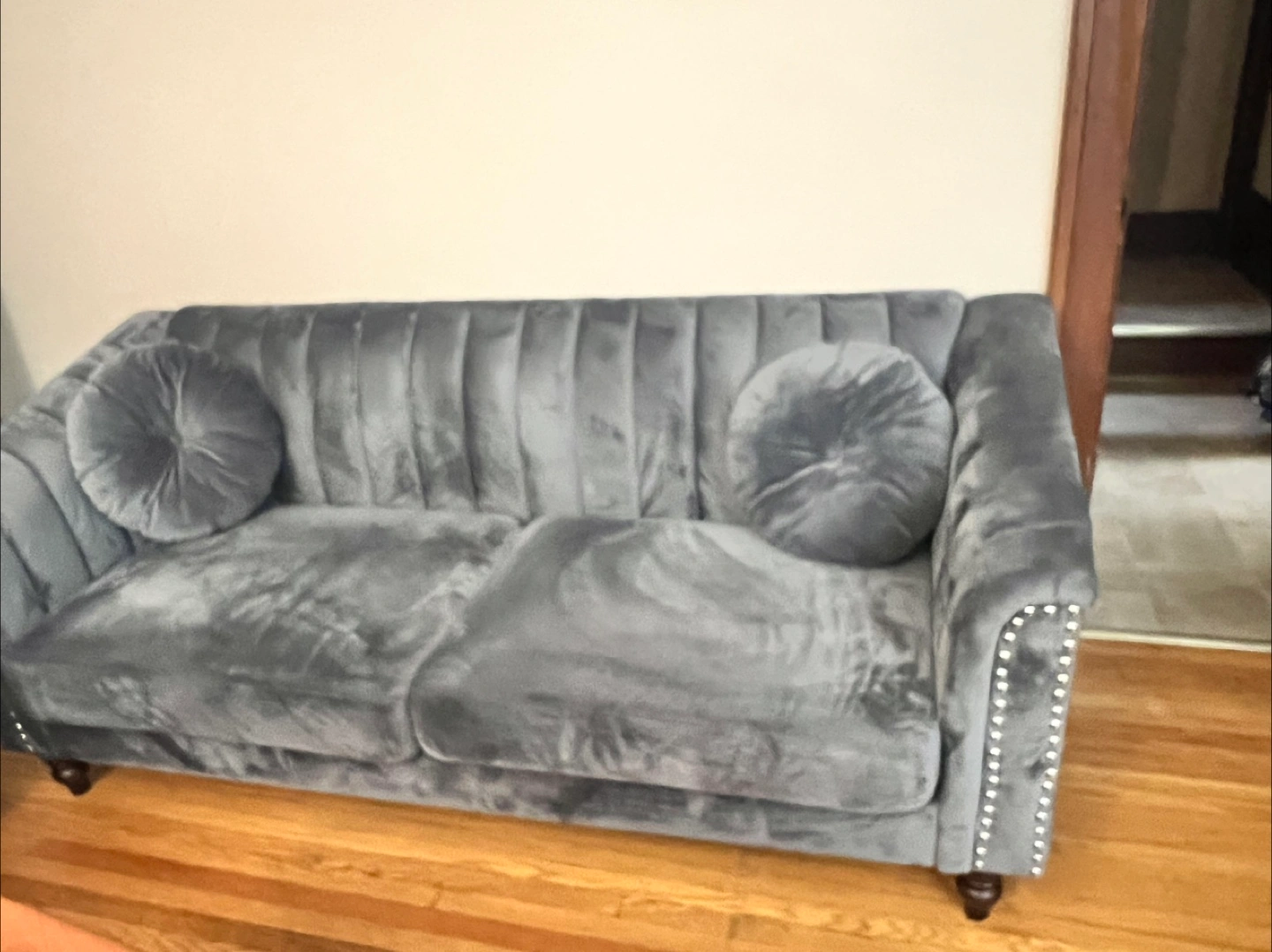 Selling a beautiful grey velvet sofa and loveseat set! It's in great condition and would look amazing in any living room. The velvet material is so soft and comfortable, perfect for lounging and relaxing after a long day. The set also includes decorative round pillows to enhance the style. A great addition to any home!