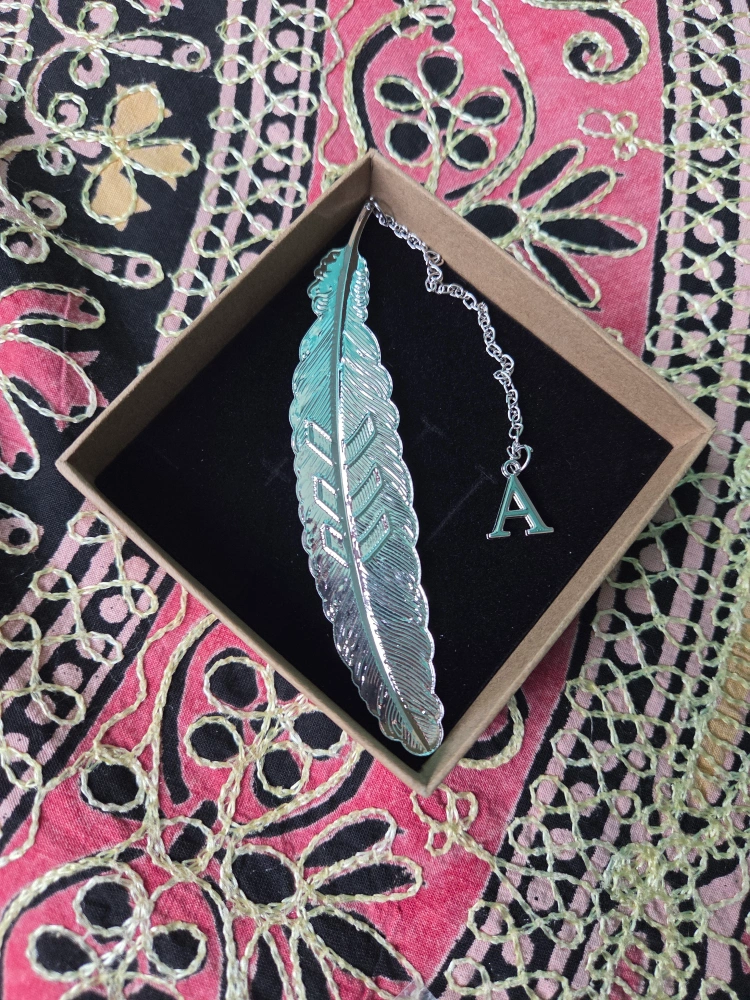 Selling a lovely feather bookmark that comes with an initial 'A' charm. It's in excellent condition and comes in its original box. Perfect for any book lover!