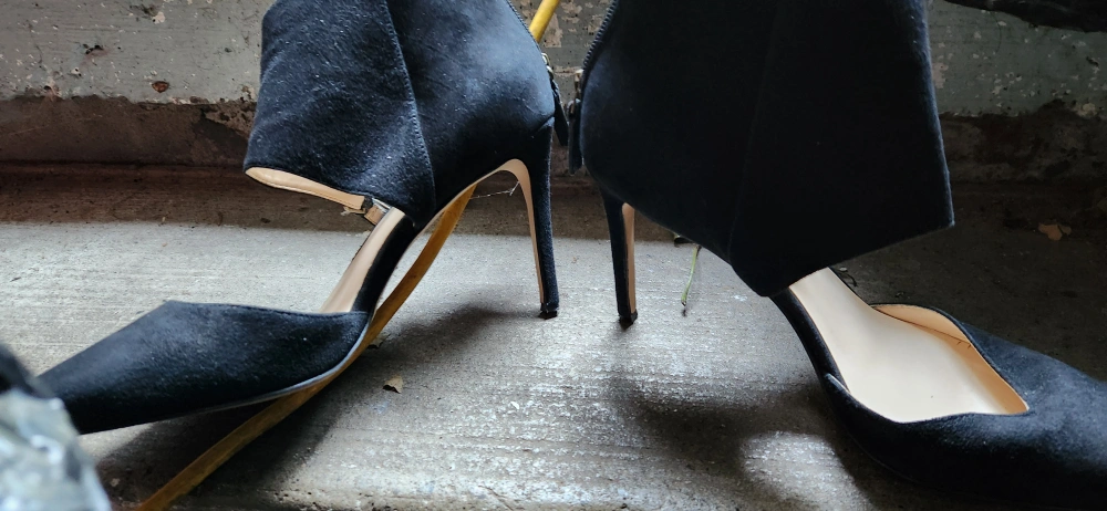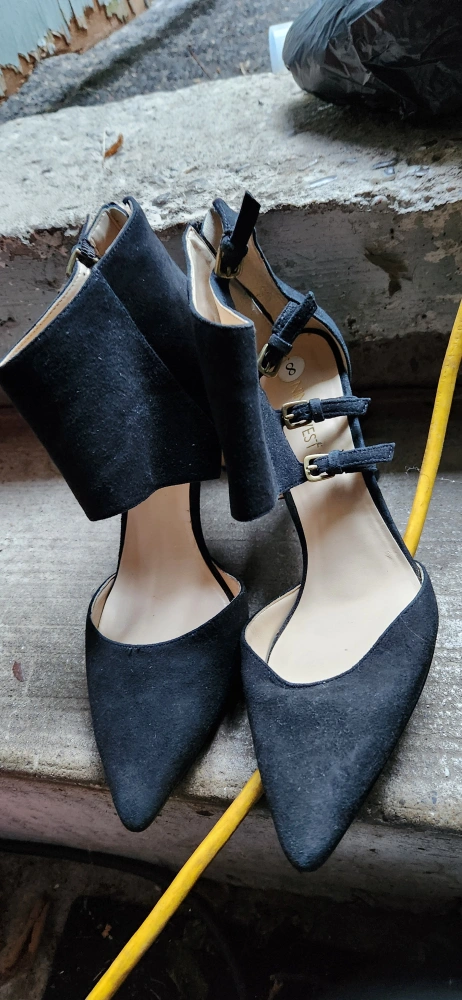 These are a pair of black heels from West Nine in a size 8. They have a stylish design with straps and a suede-like texture. Perfect for dressing up an outfit!