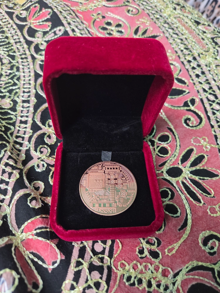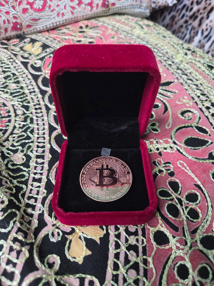 Selling a Bitcoin commemorative coin, complete with a velvet box. It's a great piece for any crypto enthusiast or collector! The coin features the Bitcoin logo on one side and a circuit board design on the other. It's in excellent condition and ready for a new home