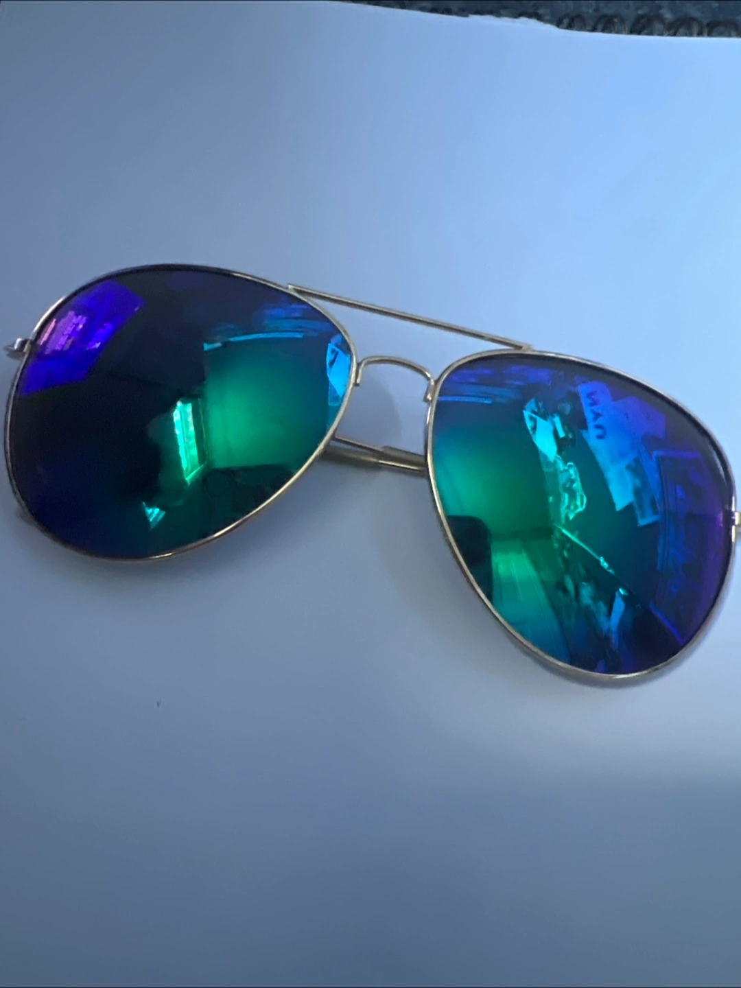 Selling a pair of aviator sunglasses. They feature a classic design with a gold frame and reflective lenses. Perfect for adding a touch of style to any outfit!