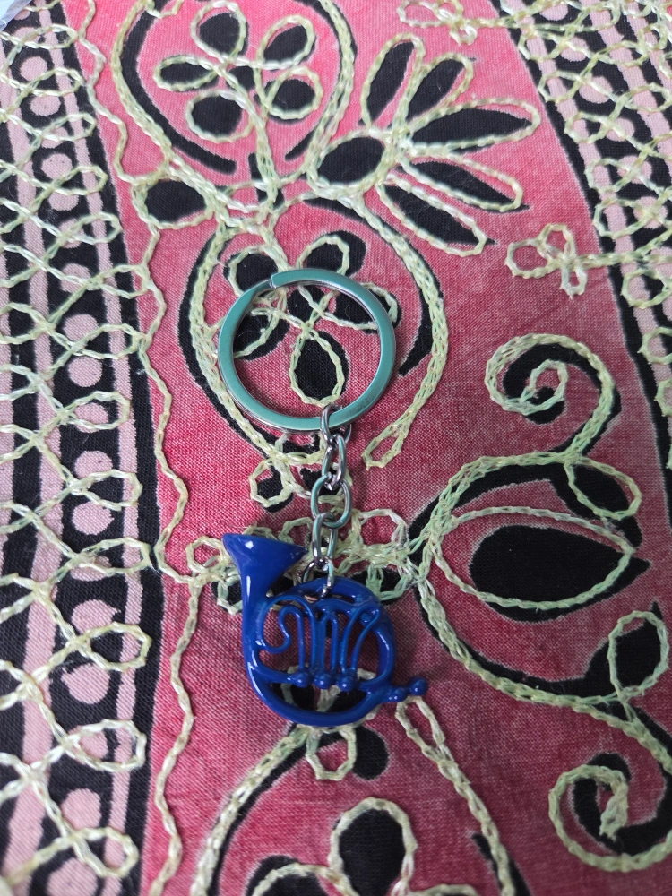 Here's a cute blue French horn keychain. It's in great shape and would be perfect for any music lover!